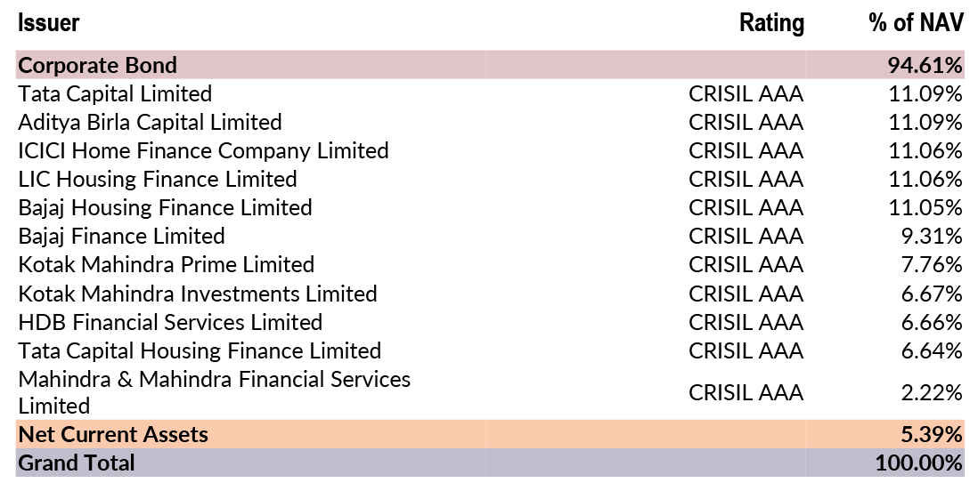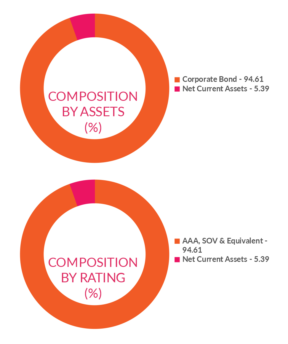 ![]() | RESIDUAL MATURITY* | 1.59 years | MODIFIED DURATION* | 1.41 years | MACAULAY DURATION* | 1.51 years | Annualised Portfolio YTM * | 6.95% |