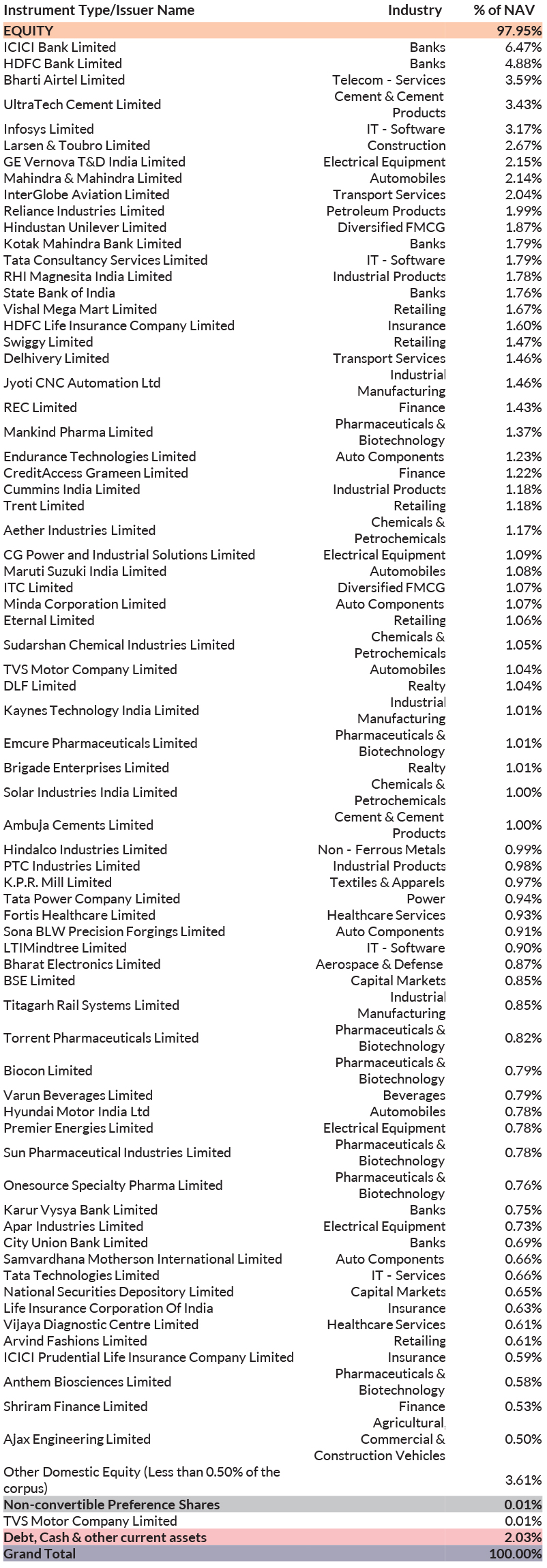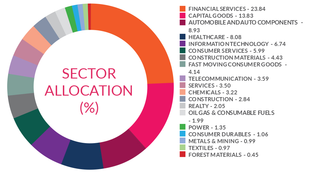 ^^Market caps are defined as per SEBI regulations as below: a. Large Cap: 1st -100th company in terms of full market capitalization. b. Mid Cap: 101st -250th company in terms of full market capitalization. c. Small Cap: 251st company onwards in terms of full market capitalization.