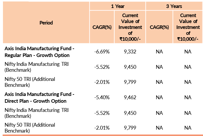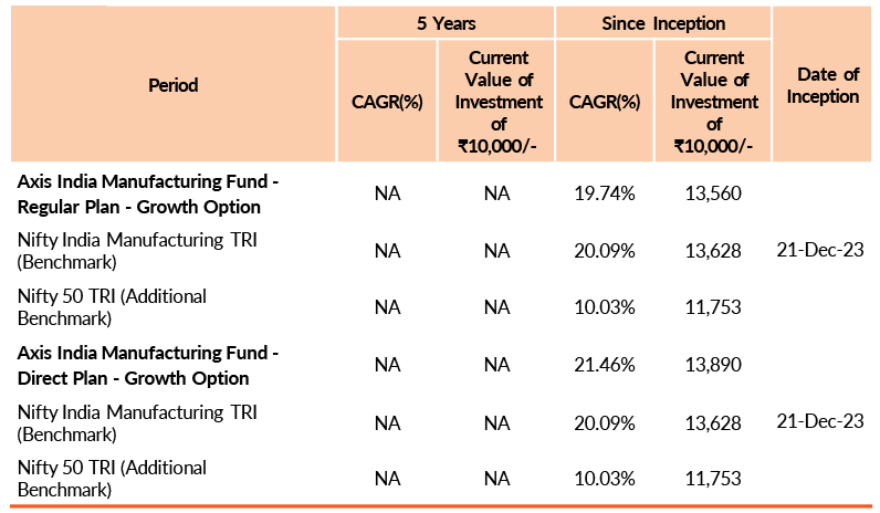 Past performance may or may not be sustained in future.Different plans have different expense structure. Shreyash Devalkar is managing the scheme since 21st December 2023 and he manages 8 schemes of Axis Mutual Fund & Nitin Arora is managing the scheme since 21st December 2023 and he manages 4 schemes of Axis Mutual Fund .Please refer to annexure for performance of all schemes managed by the fund manager. Returns greater than 1 year period are compounded annualised (CAGR). Face Value per unit : ₹ 10.