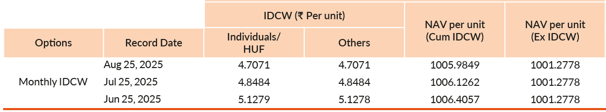 Pursuant to payment of Distribution (of Income & Capital), the NAV of the above stated IDCW options of the scheme/plan would fall to the extent of payout and statutory levy, if any. Past performance may or