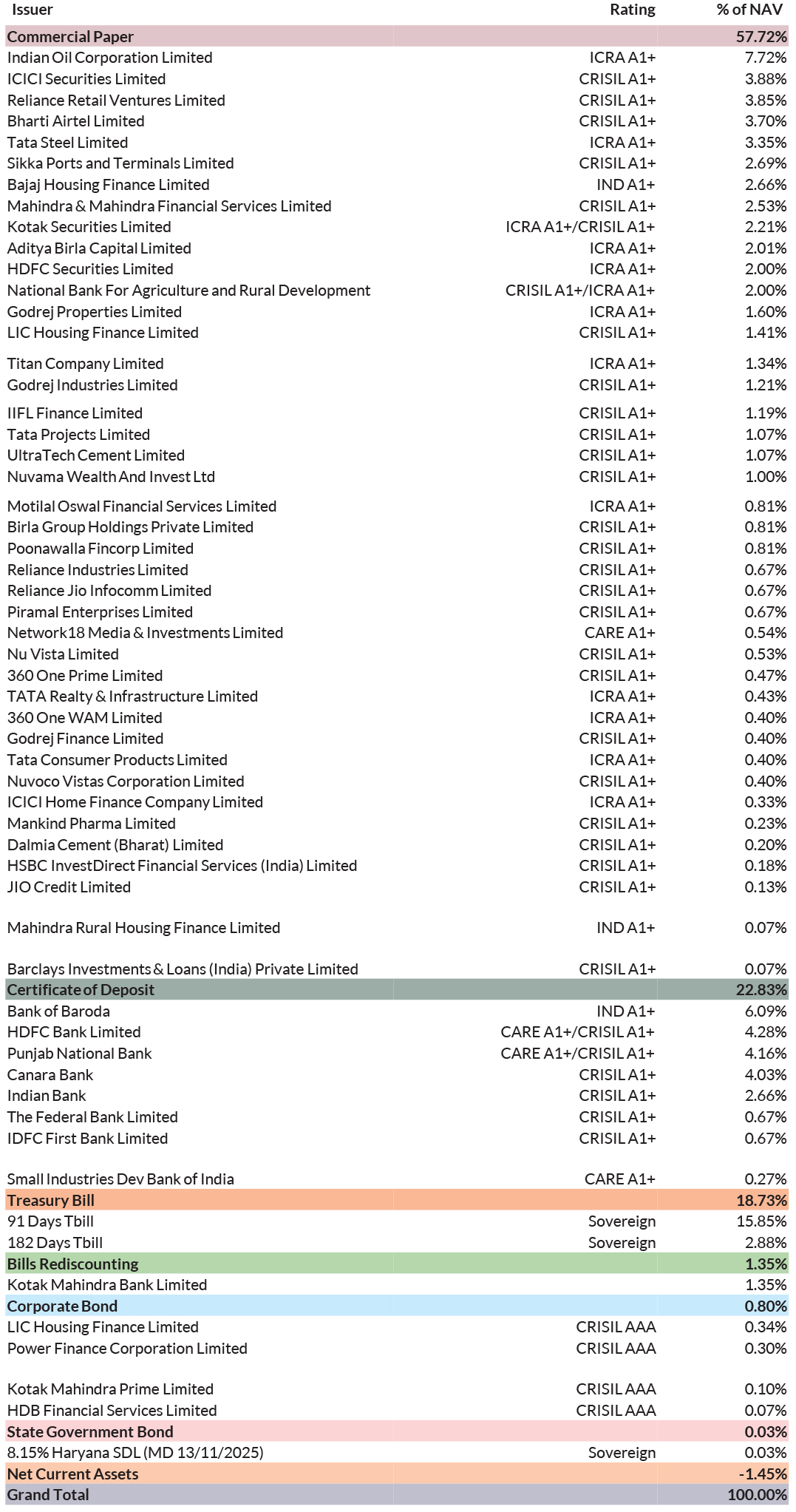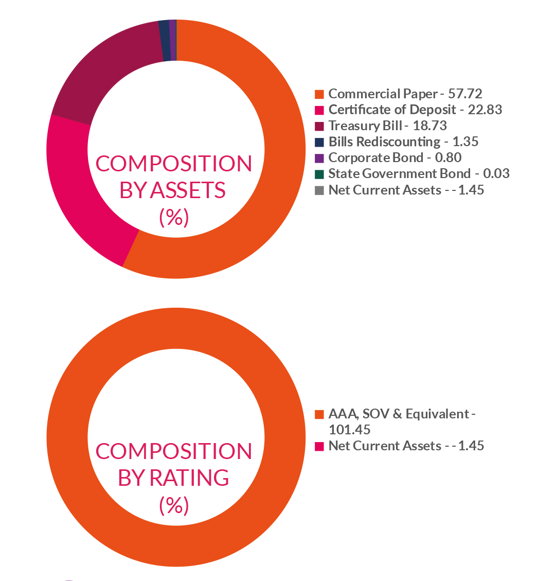 ![]() | Residual Maturity | 42 days | Modified Duration* | 40 days | Macaulay Duration* | 42 days | Annualised Portfolio YTM* | 5.90% | *in case of semi annual YTM, it will be annualised |