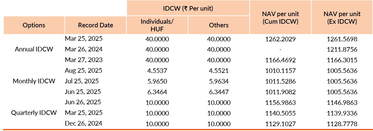Pursuant to payment of Distribution (of Income & Capital), the NAV of the above stated IDCW options of the scheme/plan would fall to the extent of payout and statutory levy, if any. Past performance may or may not be sustained in future. Face value of units is ₹1000. IDCW means Income Distribution cum Capital Withdrawal.