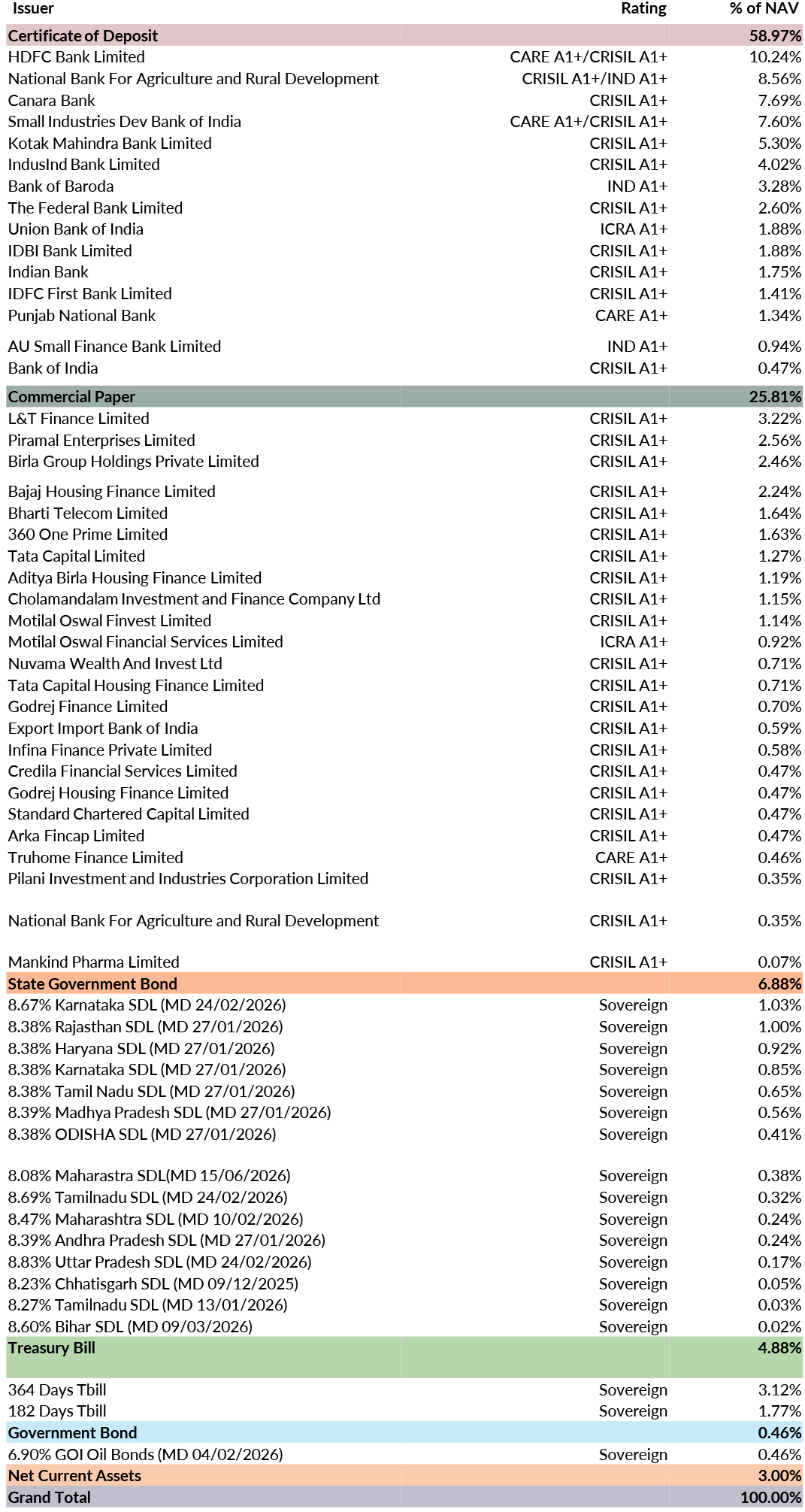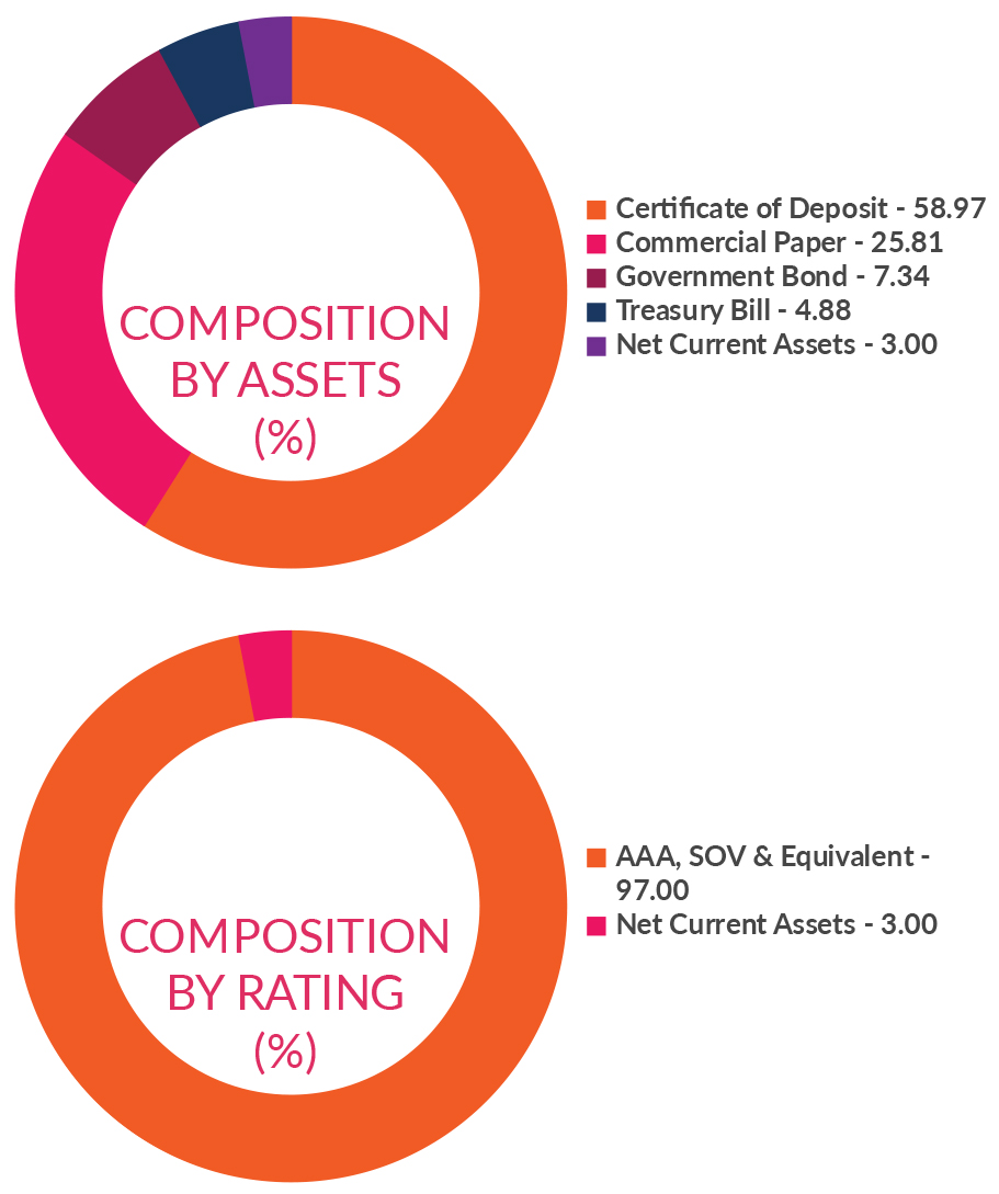 ![]() | Residual Maturity* | 170 days | Modified Duration* | 160 days | Macaulay Duration* | 170 days | Annualised Portfolio YTM* | 6.24% | *in case of semi annual YTM, it will be annualised |