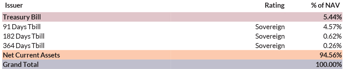 ![]() | Residual Maturity | 2 days | Modified Duration* | 2 days | Macaulay Duration* | 2 days | Annualised Portfolio YTM* | 5.48% | *in case of semi annual YTM, it will be annualised |