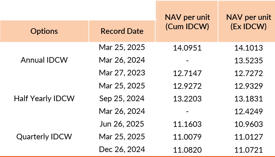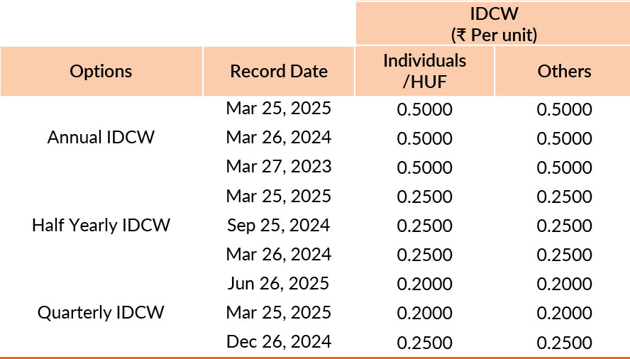 Pursuant to payment of Distribution (of Income & Capital), the NAV of the above stated IDCW options of the scheme/plan would fall to the extent of payout and statutory levy, if any. Past performance may or may not be sustained in future. Face value of units is ₹ 10. IDCW means Income Distribution cum Capital Withdrawal.