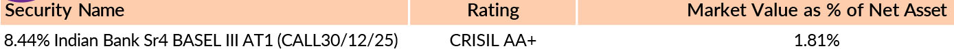 *in case of semi annual YTM, it will be annualised *As per AMFI Best Practices Guidelines Circular No. 88 / 2020 -21-Additional Disclosures in Monthly Factsheets. @ Based on debt portfolio only. For instruments with put/call option, the put/call date has been taken as the maturity date. This should not be taken as an indication of the returns that maybe generated by the fund and the securities bought by the fund may or may not be held till their respective maturities. The calculation is based on the invested corpus of the debt portfolio. | ||