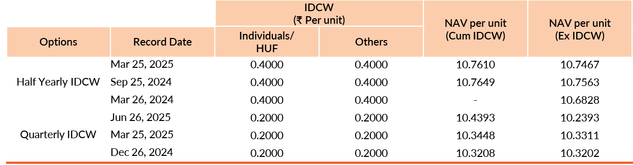 Pursuant to payment of Distribution (of Income & Capital), the NAV of the above stated IDCW options of the scheme/plan would fall to the extent of payout and statutory levy, if any. Past performance may or may not be sustained in future. Face value of units is ₹10. IDCW means Income Distribution cum Capital Withdrawal.
