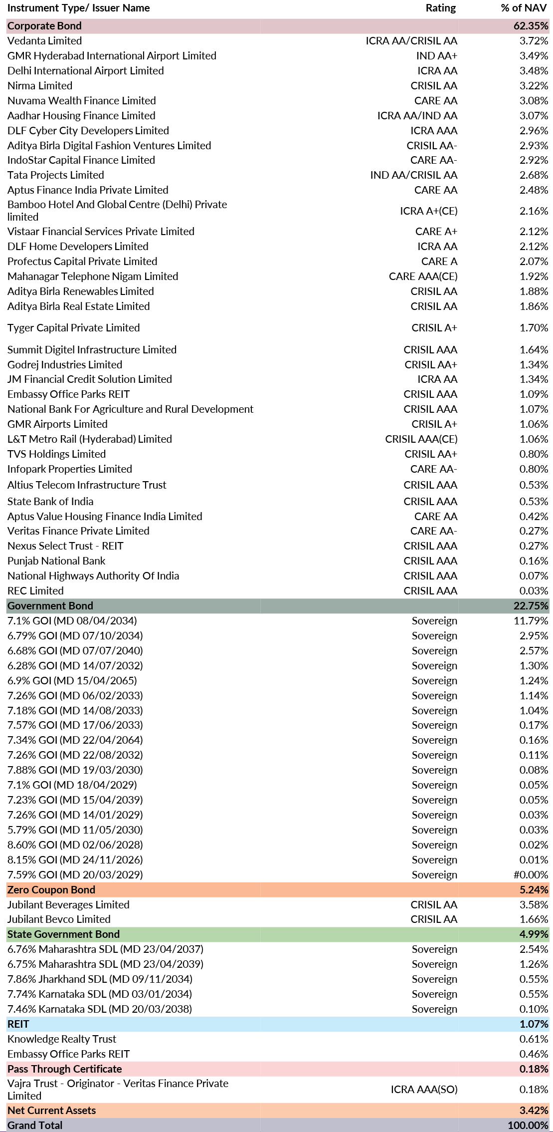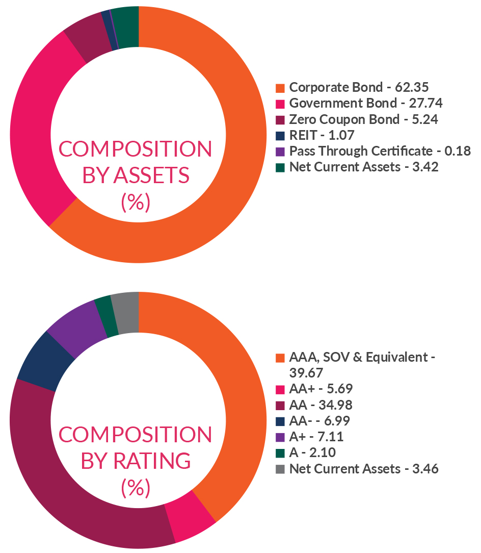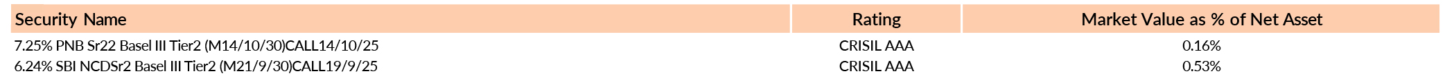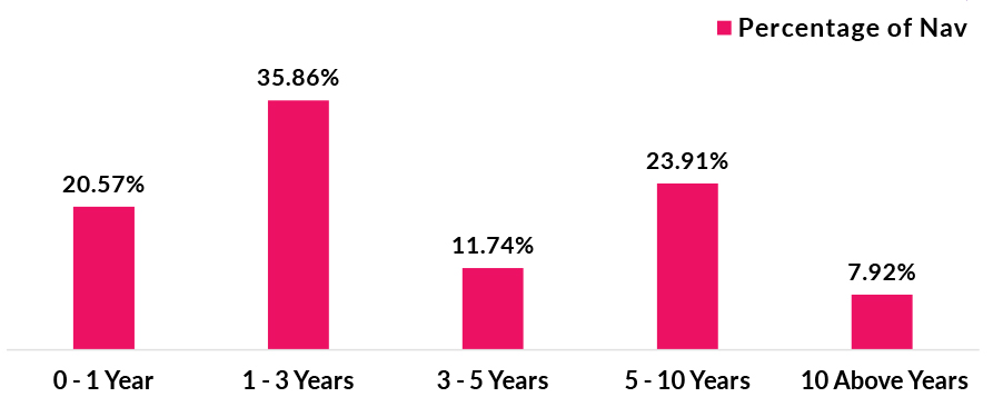 *in case of semi annual YTM, it will be annualised #Portfolio YTM adjusted for bank bonds with optionality by considering their Yield To Call at respective call dates * As per AMFI Best Practices Guidelines Circular No. 88 / 2020 -21-Additional Disclosures in Monthly Factsheets. For instruments with put/call option, the put/call date has been taken as the maturity date. This should not be taken as an indication of the returns that maybe generated by the fund and the securities bought by the fund may or may not be held till their respective maturities. The calculation is based on the invested corpus of the debt portfolio. |