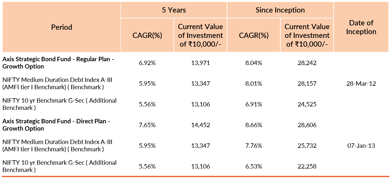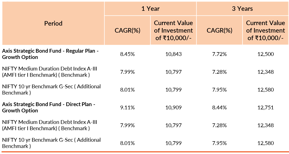 Past performance may or may not be sustained in future. Different plans have different expense structure. Devang Shah is managing the scheme since 5th November 2012 and he manages 21 schemes of Axis Mutual Fund & Akhil Thakker is managing the scheme since 1st February 2023 and he manages 2 schemes of Axis Mutual Fund & Sachin Jain is managing the scheme since 1st February 2023 and he manages 13 schemes of Axis Mutual Fund . Please refer to annexure for performance of schemes managed by the fund manager. Returns greater than 1 year period are compounded annualised (CAGR). Face Value per unit : ₹10.