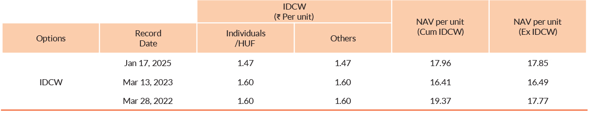 Pursuant to payment of Distribution (of Income & Capital), the NAV of the above stated IDCW options of the scheme/plan would fall to the extent of payout and statutory levy, if any. Past performance may or may not be sustained in future. Face value of units is ₹ 10. IDCW means Income Distribution cum Capital Withdrawal.