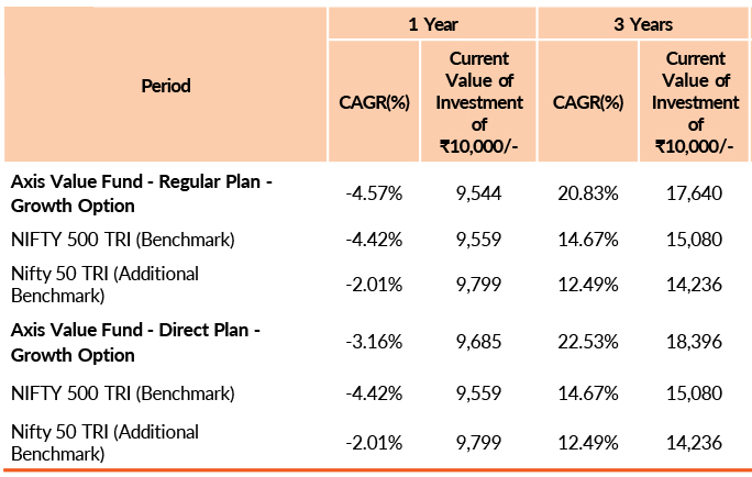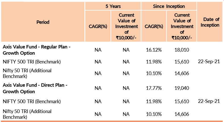 Past performance may or may not be sustained in future.Different plans have different expense structure. Nitin Arora is managing the scheme since 26th May 2023 and he manages 4 schemes of Axis Mutual Fund & Krishnaa N is managing the scheme since 1st March 2024 and she manages 24 schemes of Axis Mutual Fund. Please refer to annexure for performance of all schemes managed by the fund manager. Returns greater than 1 year period are compounded annualised (CAGR). Face Value per unit : ₹ 10.