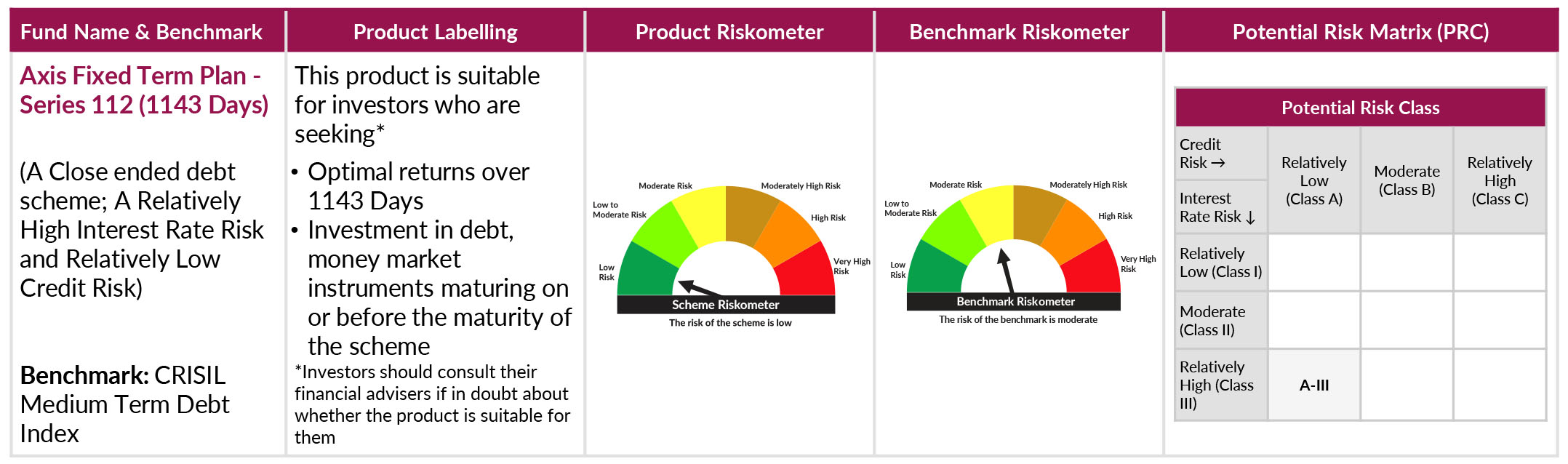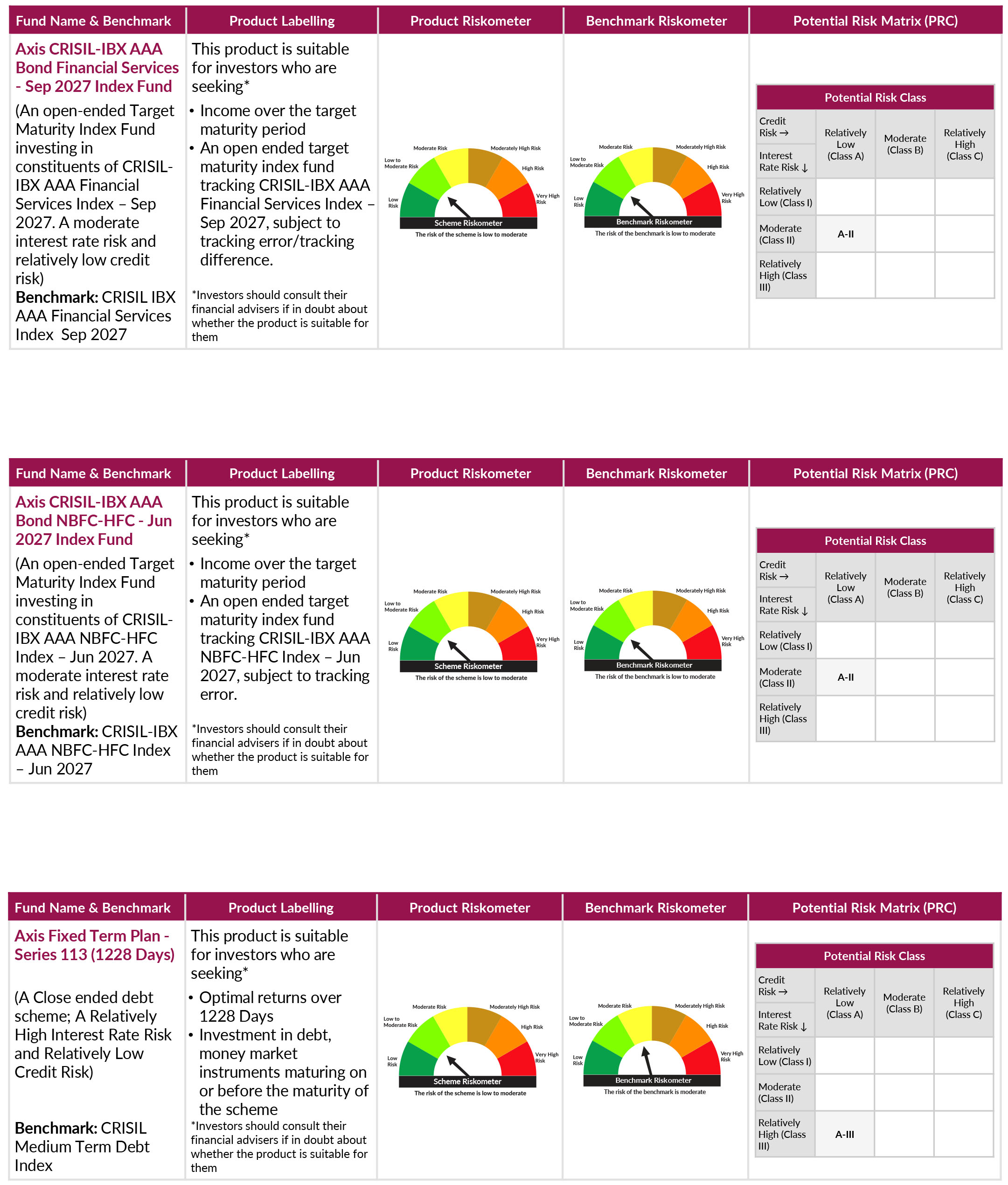 | AXIS HYBRID FUND - SERIES 35 (1359 days close ended debt scheme) This product is suitable for investors who are seeking* • Capital appreciation while generating income over medium to long term • Investment in debt and money market instruments as well as equity and equity related instruments |