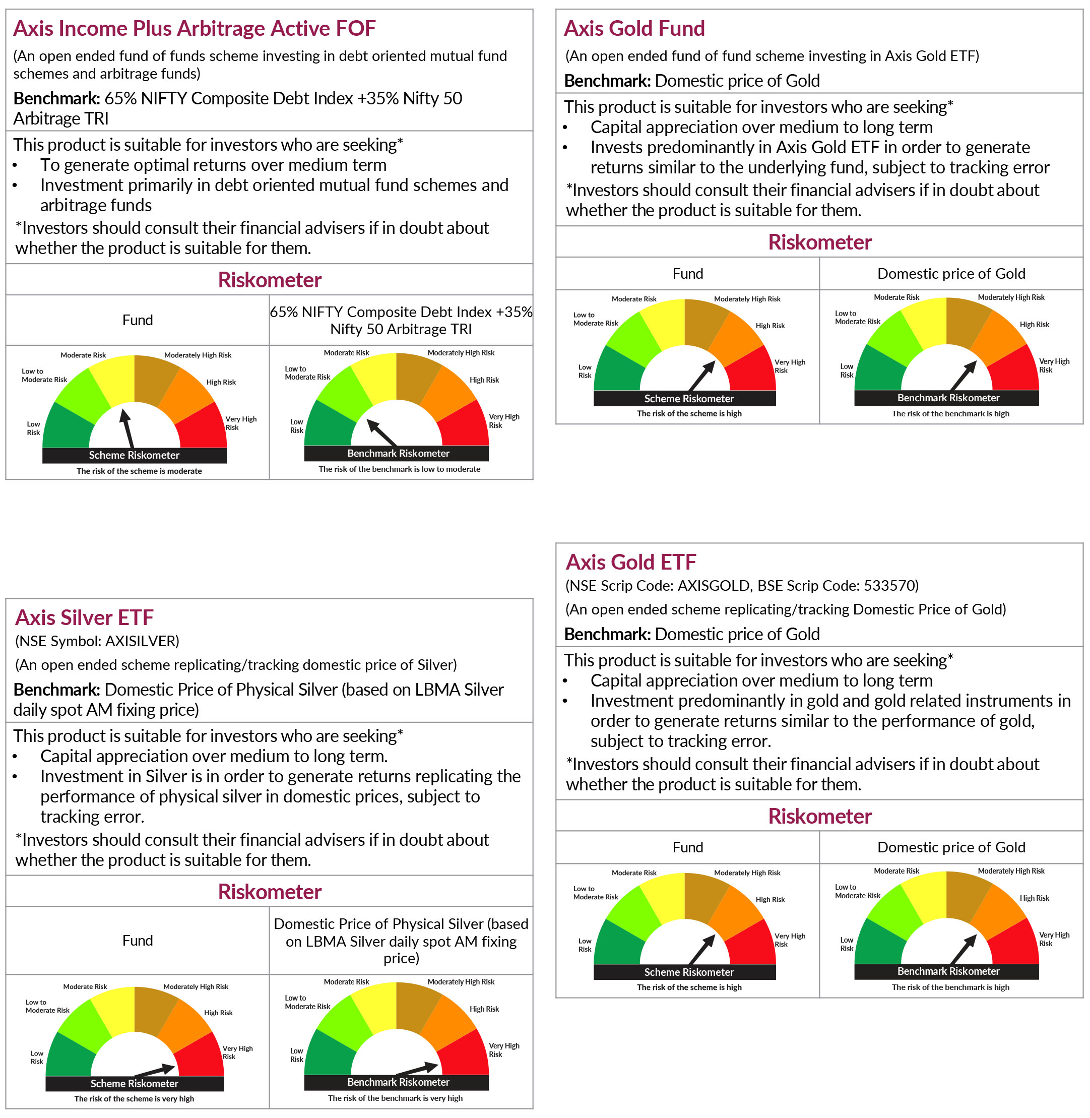 | AXIS GOLD ETF (An open ended scheme replicating/tracking Domestic Price of Gold) This product is suitable for investors who are seeking* • Capital Appreciation over medium to long term • Invests predominantly in gold in order to generate returns similar to the performance of gold, subject to tracking error |