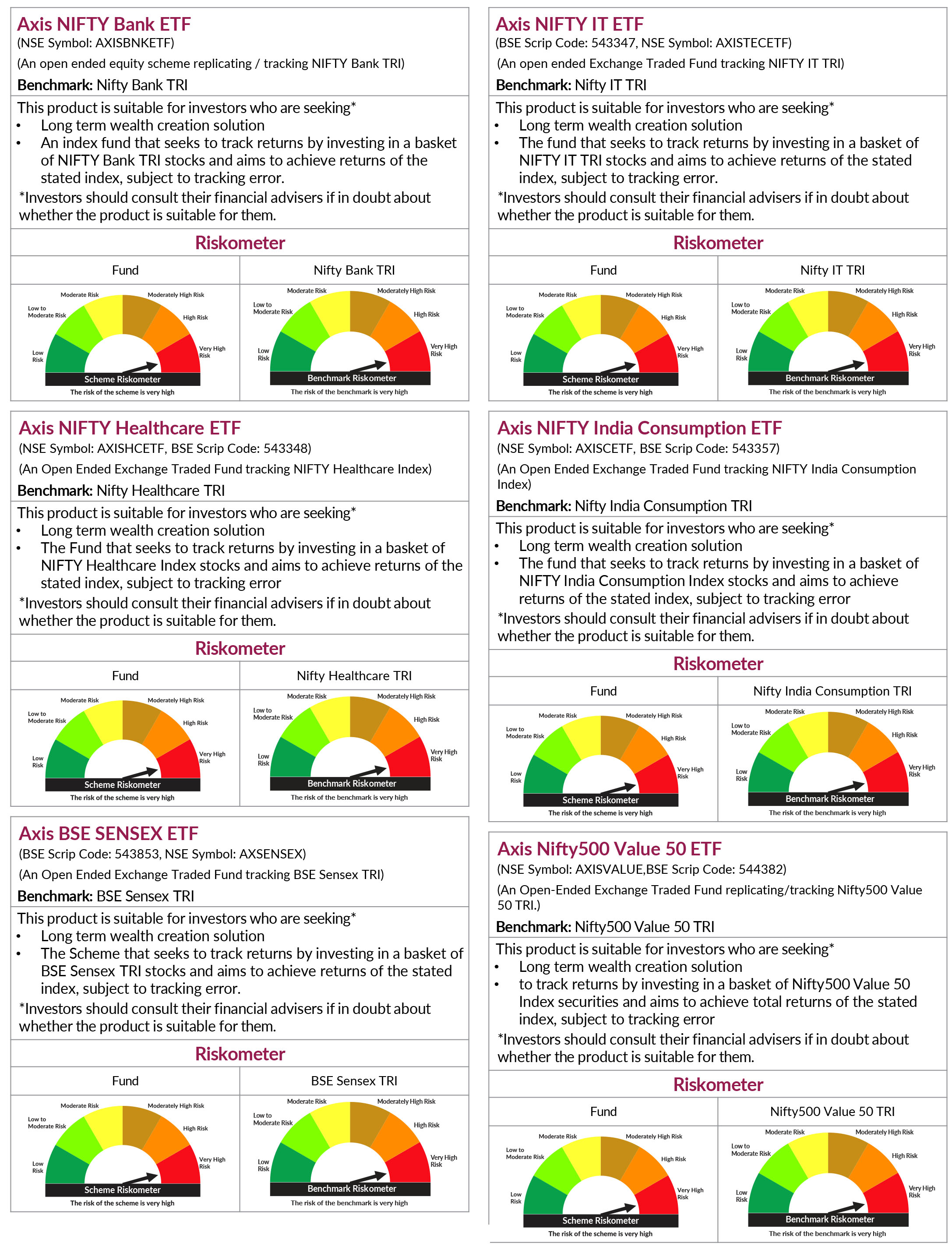 | AXIS NIFTY ETF (An open ended Scheme replicating/ tracking Nifty 50 Index) This product is suitable for investors who are seeking* • Capital appreciation over medium to long term • Investments in Equity & Equity related instruments covered by Nifty 50 Index |
