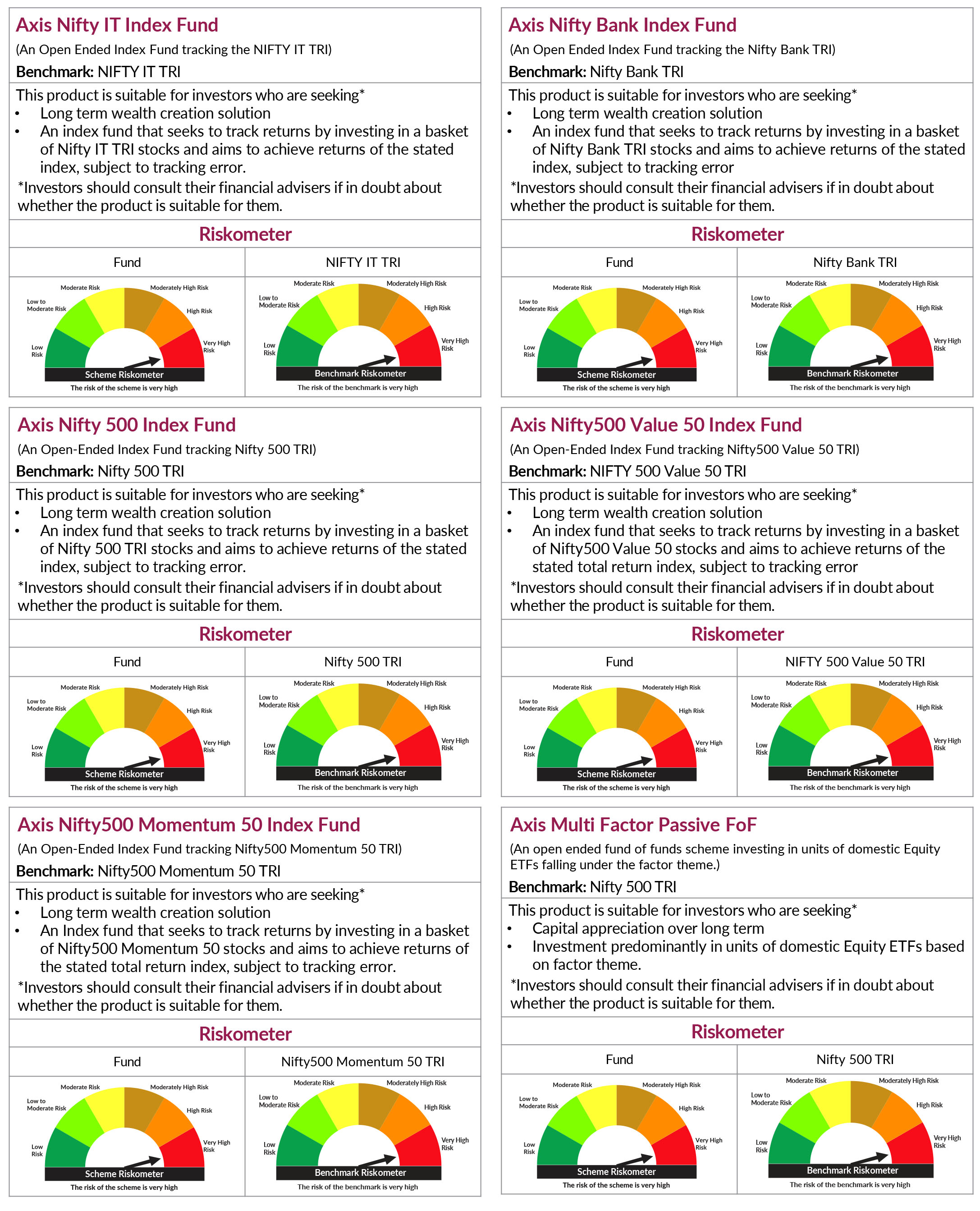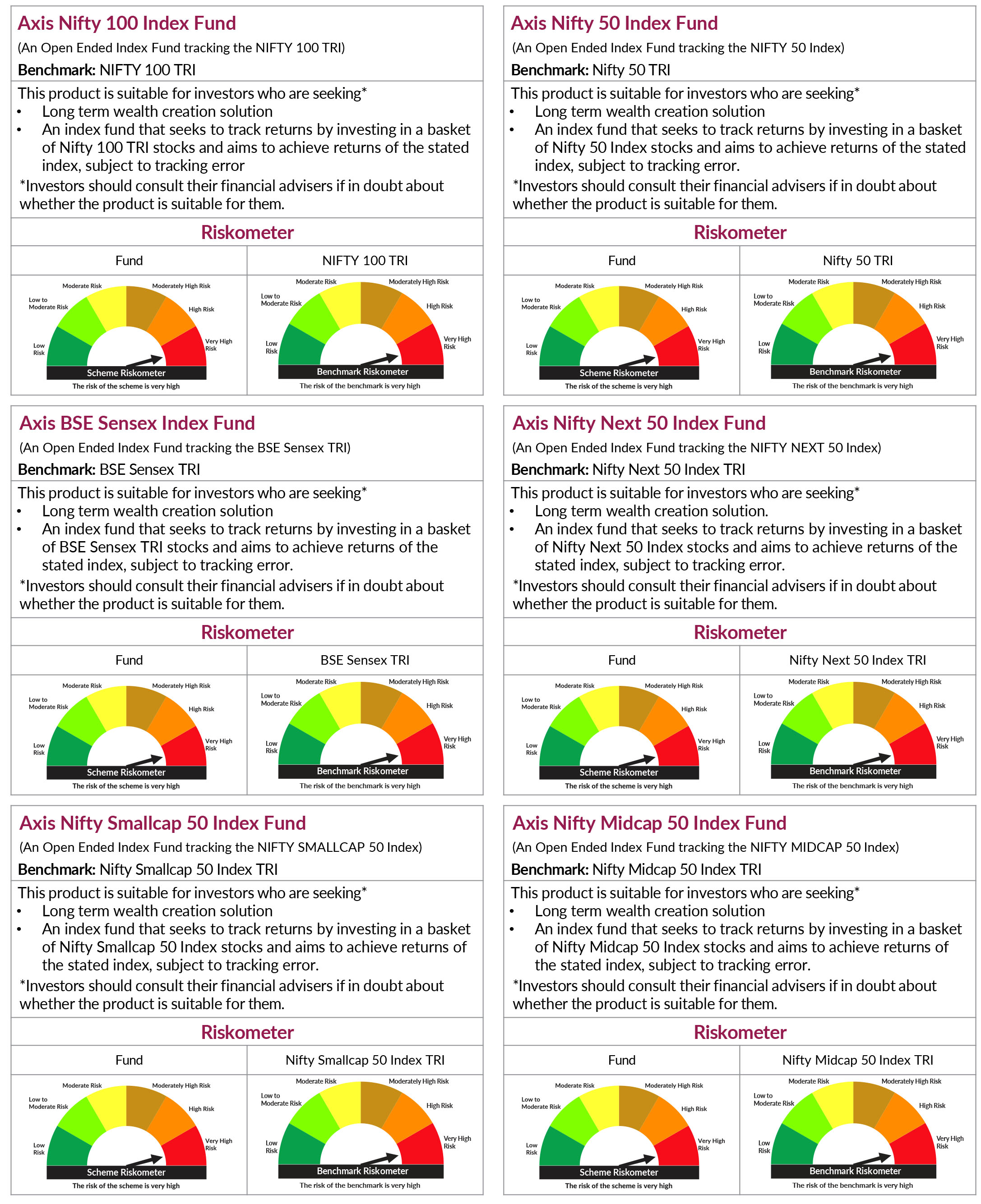 | AXIS NIFTY 100 INDEX FUND (An Open Ended Index Fund tracking the NIFTY 100 Index)) This product is suitable for investors who are seeking* • Long term wealth creation solution • An index fund that seeks to track returns by investing in a basket of Nifty 100 Index stocks and aims to achieve returns of the stated index, subject to tracking error |