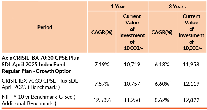 | Axis CRISIL IBX 70:30 CPSE Plus SDL DECEMBER 2025 Index Fund | 30-Apr-2025 | -0.38 | -0.47 | -- | -- | -0.47 |