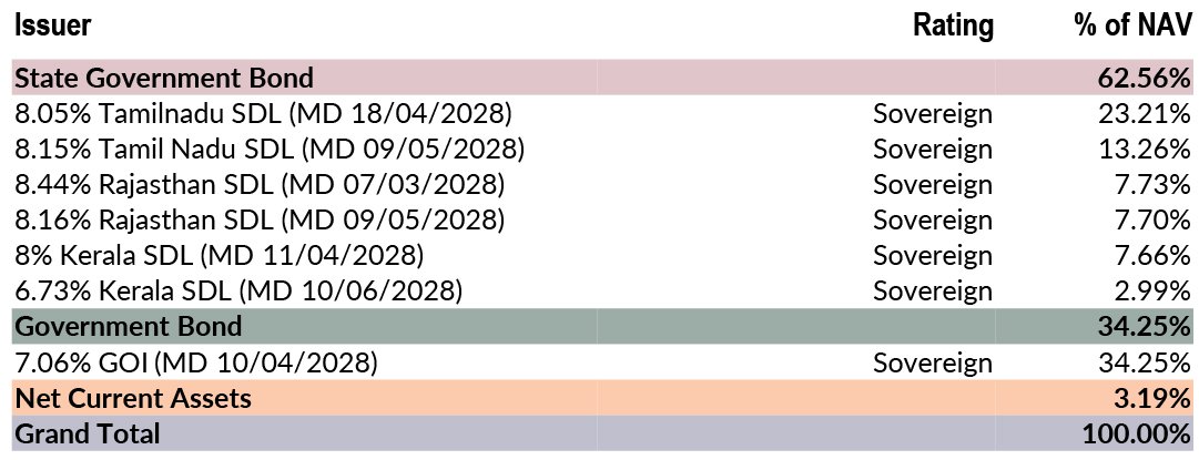 ![]() | RESIDUAL MATURITY* | 2.22 years | MODIFIED DURATION* | 1.99 years | MACAULAY DURATION* | 2.05 years | Annualised Portfolio YTM * | 6.17% |