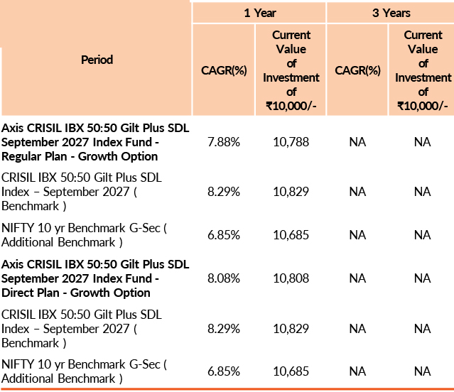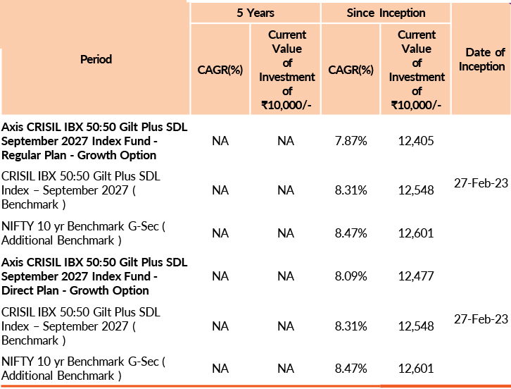 | Axis CRISIL IBX 50:50 Gilt Plus SDL September 2027 Index Fund | 31-Dec-2025 | -0.4 | - | - | - | -0.44 |