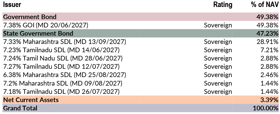![]() | RESIDUAL MATURITY* | 1.5 years | MODIFIED DURATION* | 1.39 years | MACAULAY DURATION* | 1.43 years | Annualised Portfolio YTM * | 5.95% |