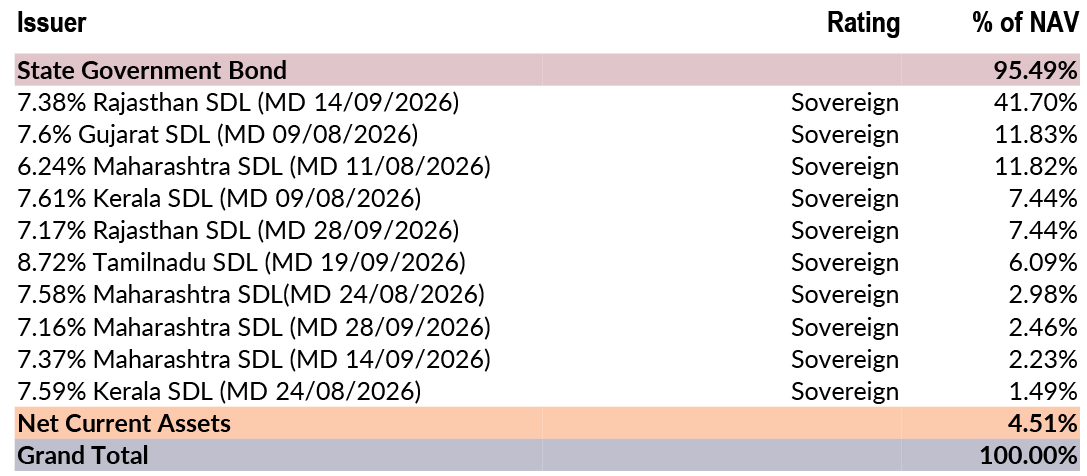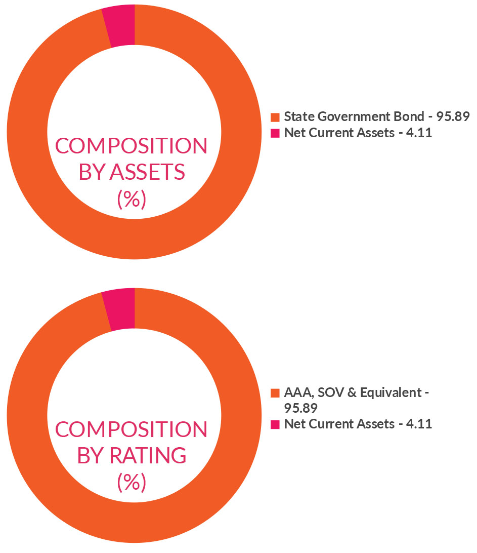 ![]() | RESIDUAL MATURITY* | 0.64 years | MODIFIED DURATION* | 0.61 years | MACAULAY DURATION* | 0.63 years | Annualised Portfolio YTM * | 5.78% |