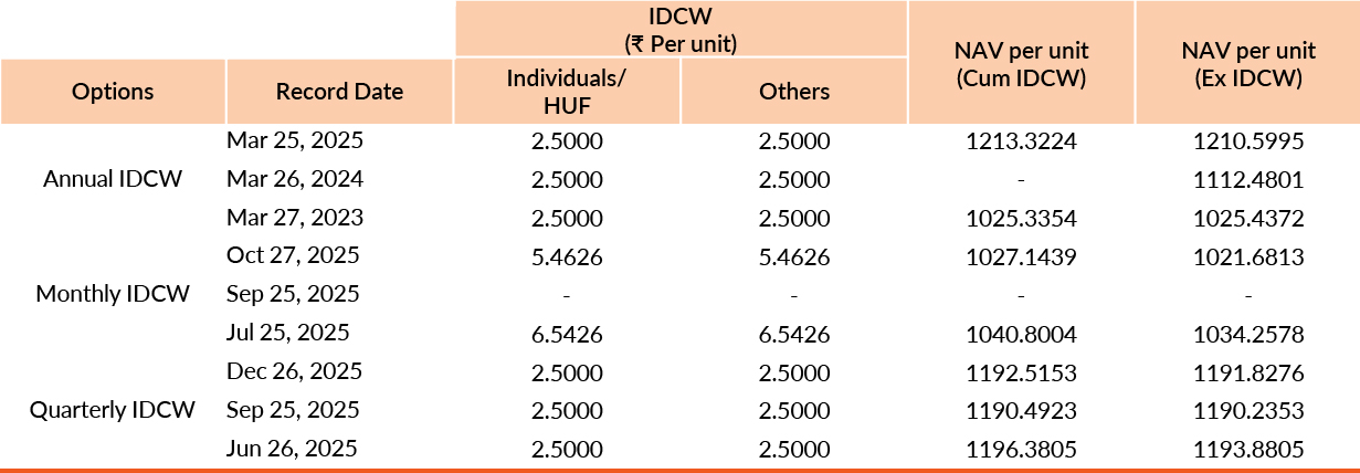 Pursuant to payment of Distribution (of Income & Capital), the NAV of the above stated IDCW options of the scheme/plan would fall to the extent of payout and statutory levy, if any. Past performance