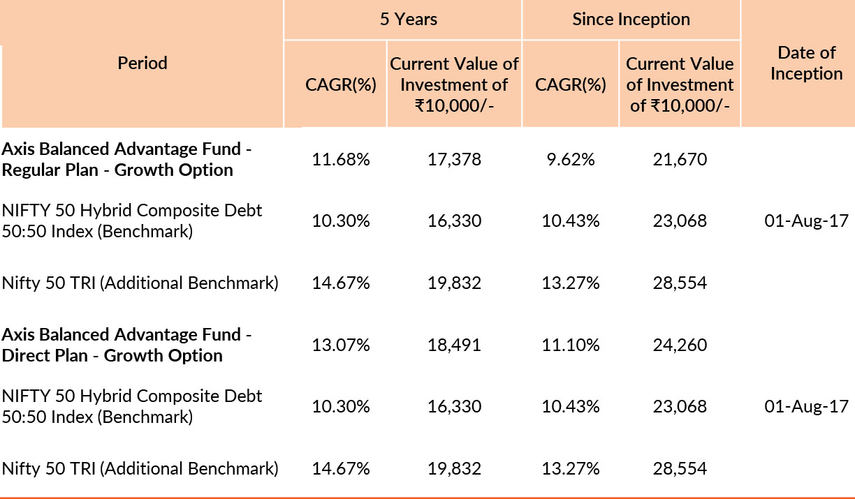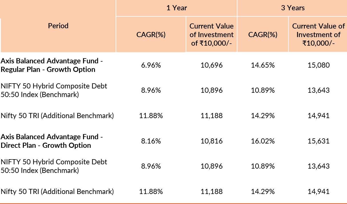 Past performance may or may not be sustained in future. Different plans have different expense structure. Jayesh Sundar is managing the scheme since 28th September 2023 and he manages 8 schemes of Axis Mutual Fund & Devang Shah is managing the scheme since 5th April 2024 and he manages 23 schemes of Axis Mutual Fund & Hardik Shah is managing the scheme since 31st January 2022 and he manages 18 schemes of Axis Mutual Fund . Please refer to annexure for performance of all schemes managed by the fund managers. Returns greater than 1 year period are compounded annualised (CAGR). Face Value per unit : ₹10.