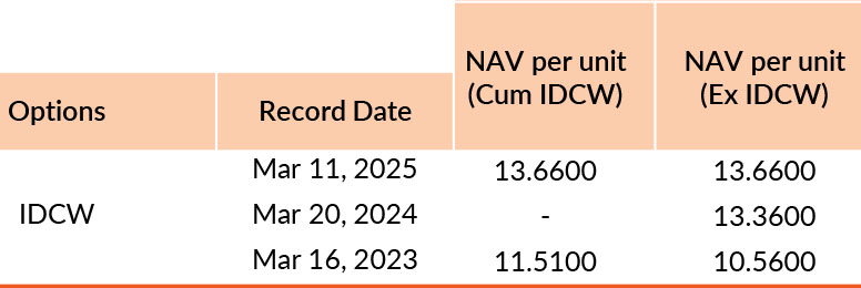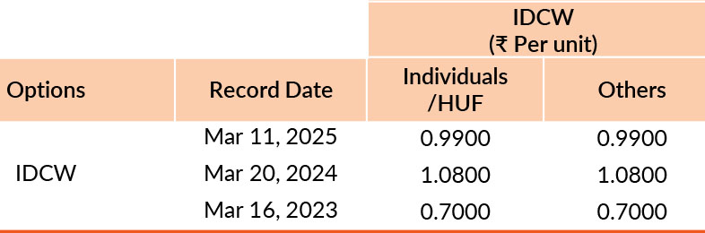 Pursuant to payment of Distribution (of Income & Capital), the NAV of the above stated IDCW options of the scheme/plan would fall to the extent of payout and statutory levy, if any. Past performance may or may not be sustained in future. Facevalue of units is ₹ 10. IDCW means Income Distribution cum Capital Withdrawal.