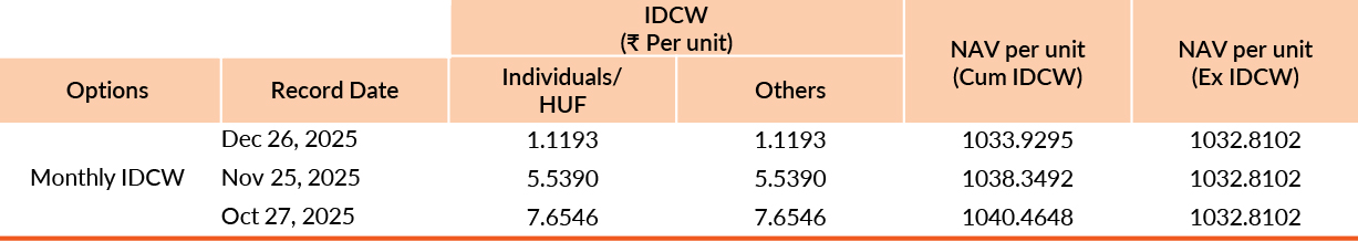 Pursuant to payment of Distribution (of Income & Capital), the NAV of the above stated IDCW options of the scheme/plan would fall to the extent of payout and statutory levy, if any. Past performance may or may not be sustained in future. Face value of units is ₹1000. IDCW means Income Distribution cum Capital Withdrawal.