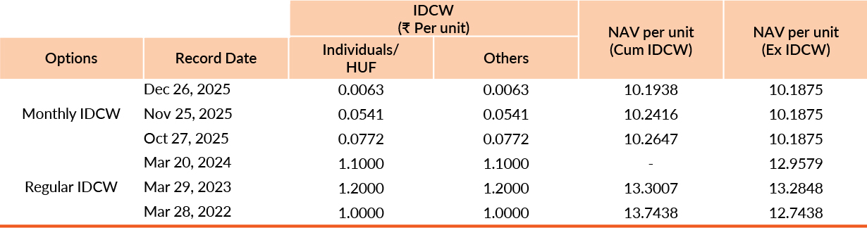 Pursuant to payment of Distribution (of Income & Capital), the NAV of the above stated IDCW options of the scheme/plan would fall to the extent of payout and statutory levy, if any. Past performance may or may not be sustained in future. Face value of units is ₹10. IDCW means Income Distribution cum Capital Withdrawal.