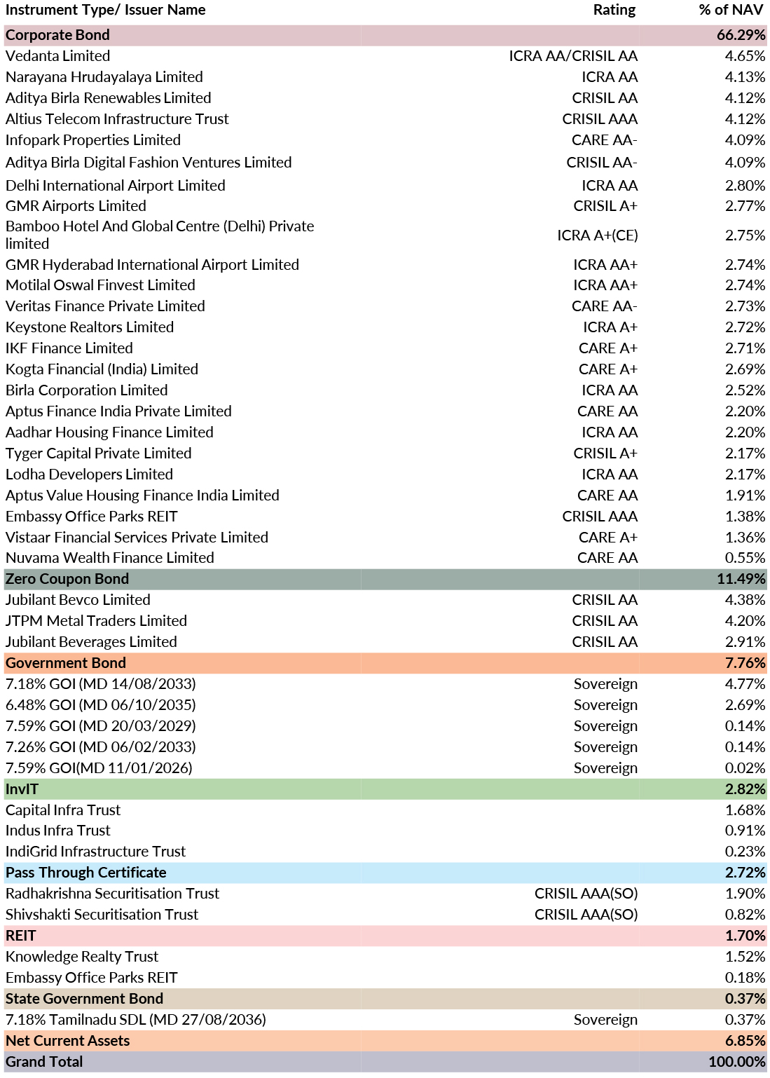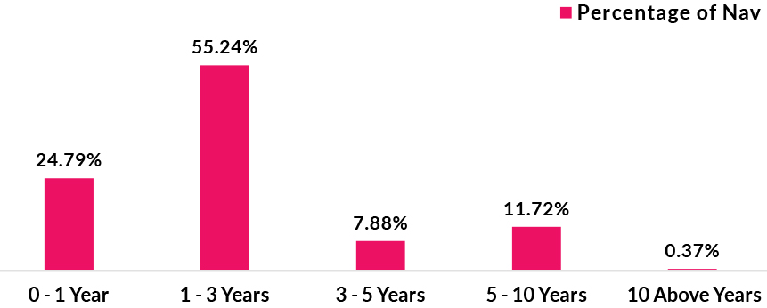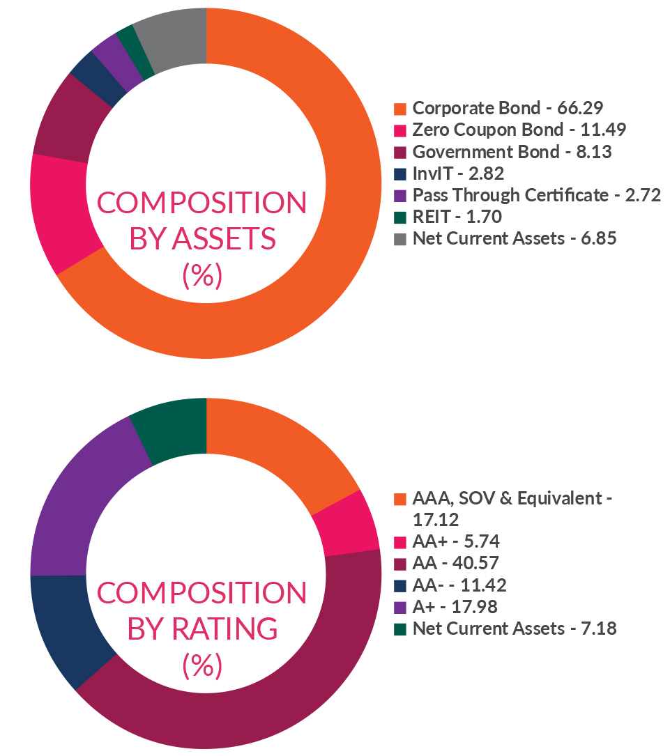 ![]() | RESIDUAL MATURITY* | 2.49 years | MODIFIED DURATION* | 2.16 years | MACAULAY DURATION* | 2.26 years | Annualised Portfolio YTM* | 8.22% *in case of semi annual YTM, it will be annualised |