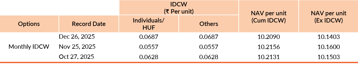 Pursuant to payment of Distribution (of Income & Capital), the NAV of the above stated IDCW options of the scheme/plan would fall to the extent of payout and statutory levy, if any. Past performance may or may not be sustained in future. Face value of units is ₹10. IDCW means Income Distribution cum Capital Withdrawal.