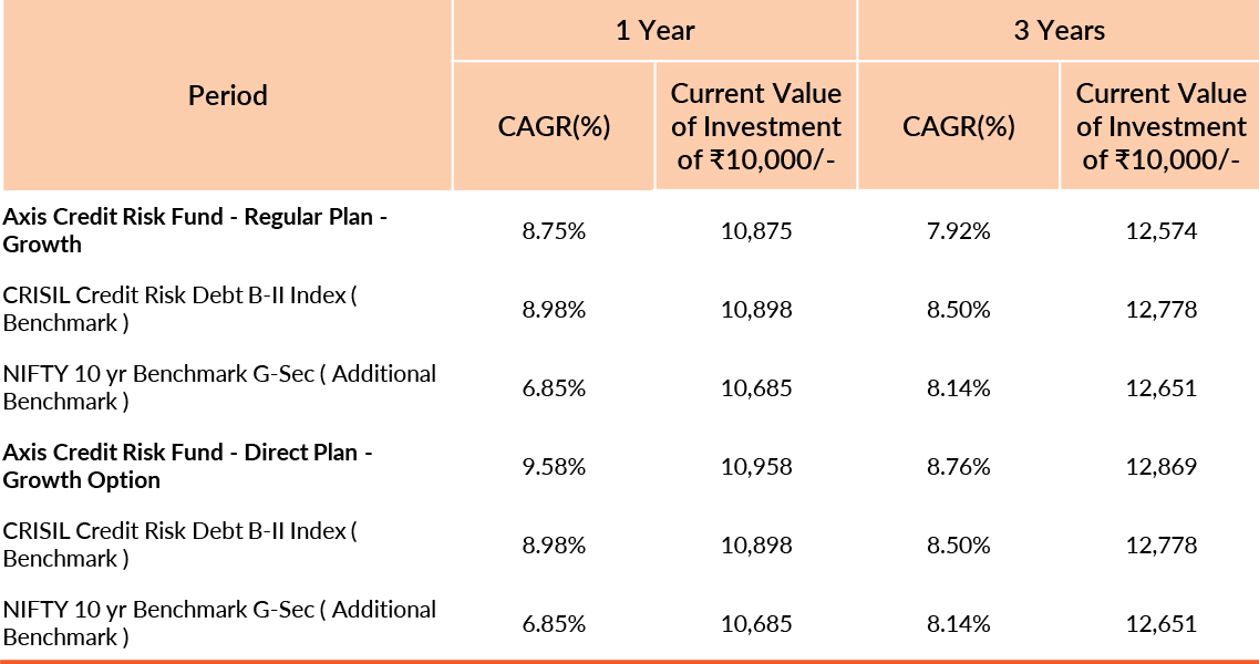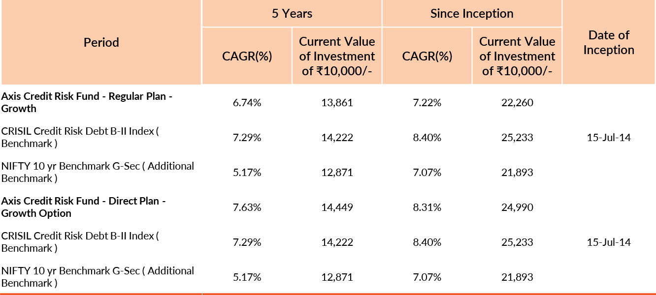 Past performance may or may not be sustained in future. Different plans have different expense structure. Devang Shah is managing the scheme since 15th July 2014 and he manages 23 schemes of Axis Mutual Fund & Akhil Thakker is managing the scheme since 9th November 2021 and he manages 2 schemes of Axis Mutual Fund . Please refer to annexure for performance of all schemes managed by the fund manager. Returns greater than 1 year period are compounded annualised (CAGR). Face Value per unit : ₹ 10.