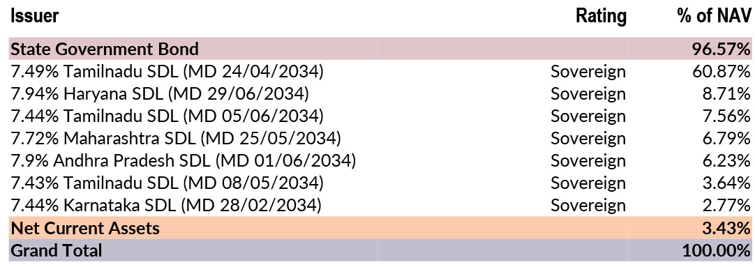 ![]() | RESIDUAL MATURITY | 8.07 years | MODIFIED DURATION* | 5.86 years | MACAULAY DURATION* | 6.07 years | Annualised Portfolio YTM * | 7.39% |