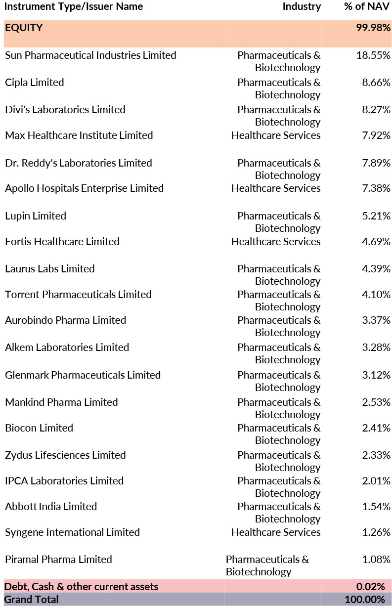 The investment objective of the Scheme is to provide returns before expenses that closely correspond to the total returns of the NIFTY Healthcare Index subject to tracking errors. There is no assurance that the investment objective of the Scheme will be achieved.