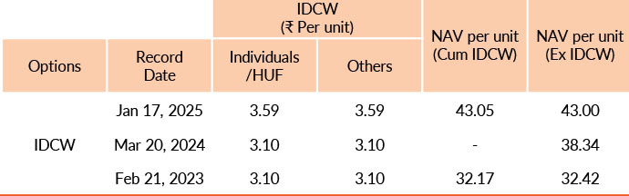 Pursuant to payment of Distribution (of Income & Capital), the NAV of the above stated IDCW options of the scheme/plan would fall to the extent of payout and statutory levy, if any. Past performance may or may not be sustained in future. Face value of units is ₹ 10. IDCW means Income Distribution cum Capital Withdrawal.