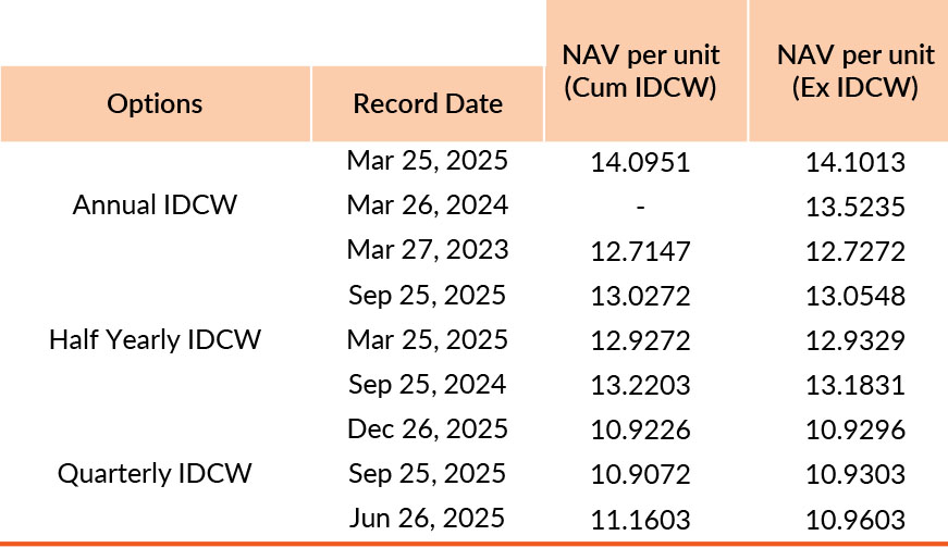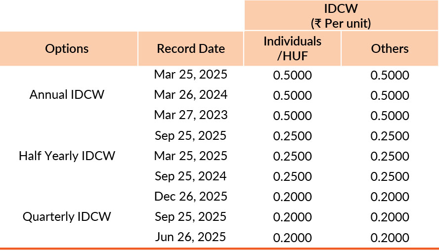 Pursuant to payment of Distribution (of Income & Capital), the NAV of the above stated IDCW options of the scheme/plan would fall to the extent of payout and statutory levy, if any. Past performance may or may not be sustained in future. Face value of units is ₹ 10. IDCW means Income Distribution cum Capital Withdrawal.