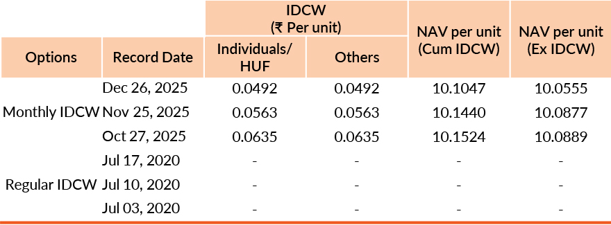 Pursuant to payment of Distribution (of Income & Capital), the NAV of the above stated IDCW options of the scheme/plan would fall to the extent of payout and statutory levy, if any. Past performance may or may not be sustained in future. Face value of units is ₹10. IDCW means Income Distribution cum Capital Withdrawal.