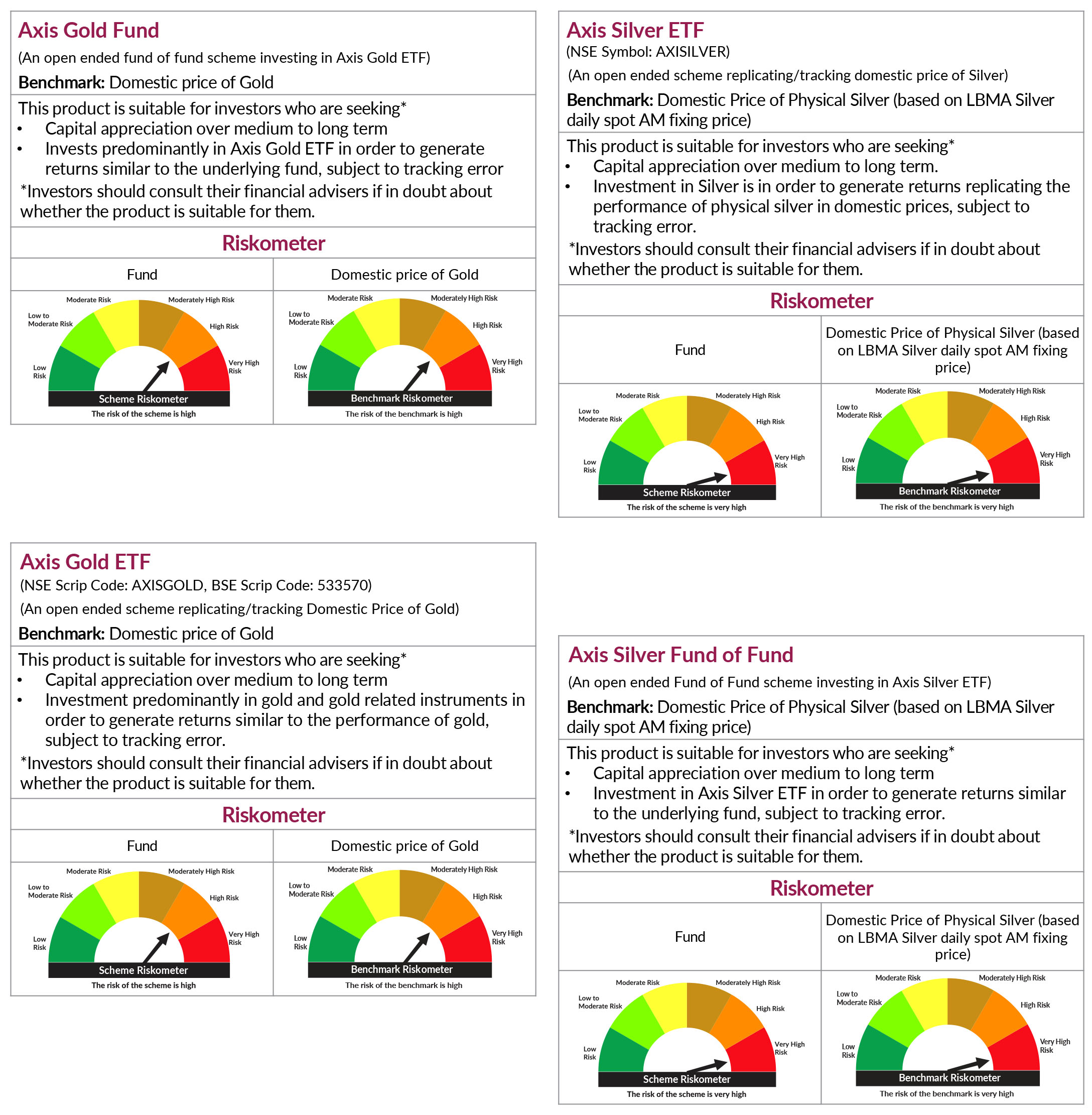 | AXIS GOLD ETF (An open ended scheme replicating/tracking Domestic Price of Gold) This product is suitable for investors who are seeking* • Capital Appreciation over medium to long term • Invests predominantly in gold in order to generate returns similar to the performance of gold, subject to tracking error |