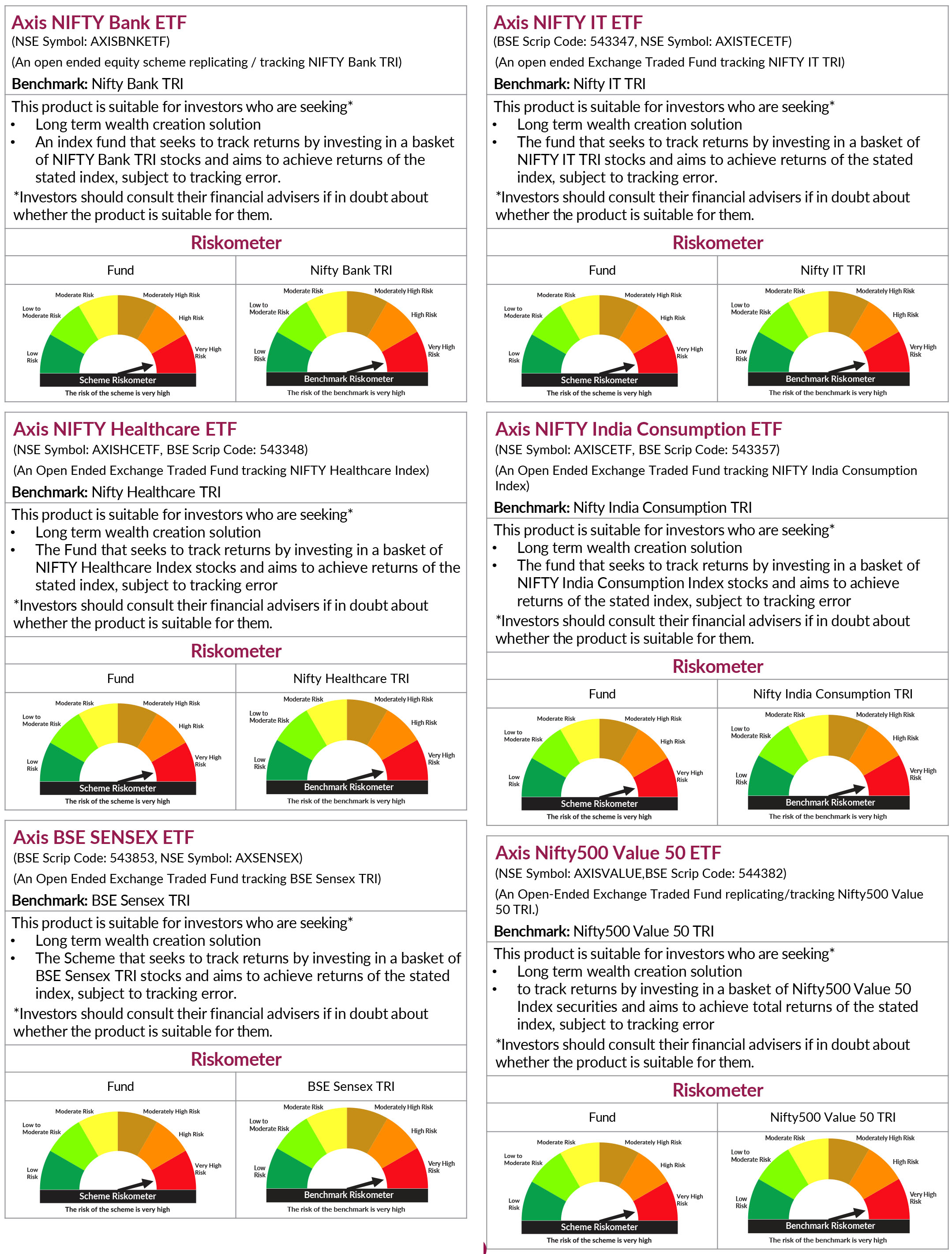 | AXIS NIFTY ETF (An open ended Scheme replicating/ tracking Nifty 50 Index) This product is suitable for investors who are seeking* • Capital appreciation over medium to long term • Investments in Equity & Equity related instruments covered by Nifty 50 Index |