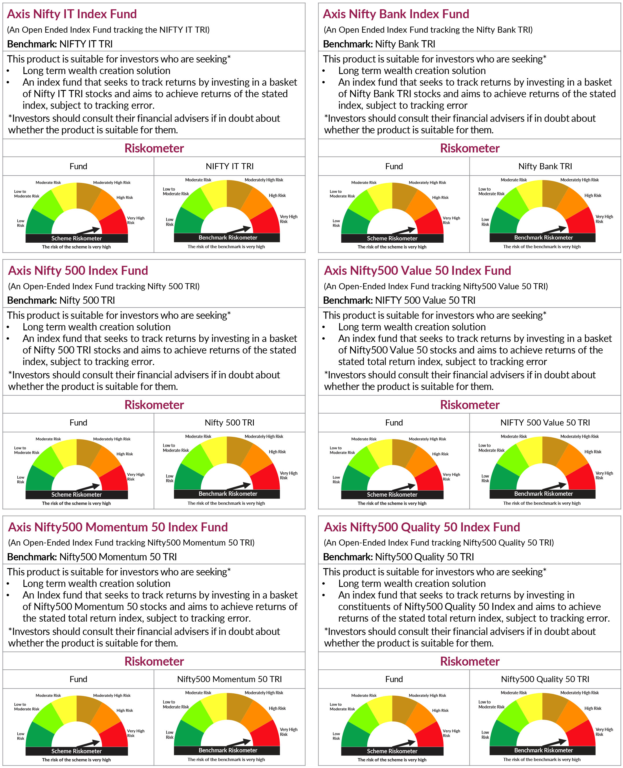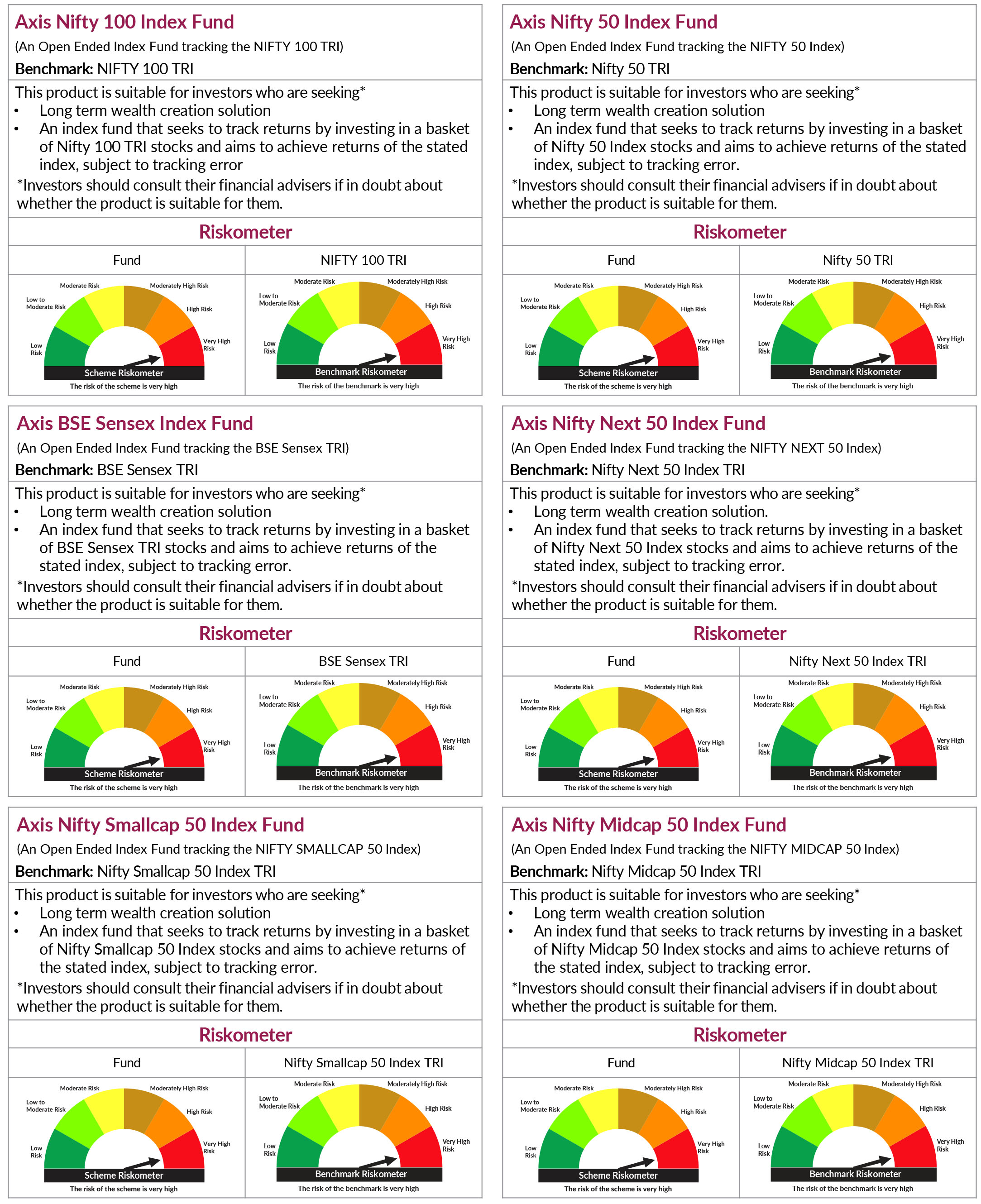 | AXIS NIFTY 100 INDEX FUND (An Open Ended Index Fund tracking the NIFTY 100 Index)) This product is suitable for investors who are seeking* • Long term wealth creation solution • An index fund that seeks to track returns by investing in a basket of Nifty 100 Index stocks and aims to achieve returns of the stated index, subject to tracking error |