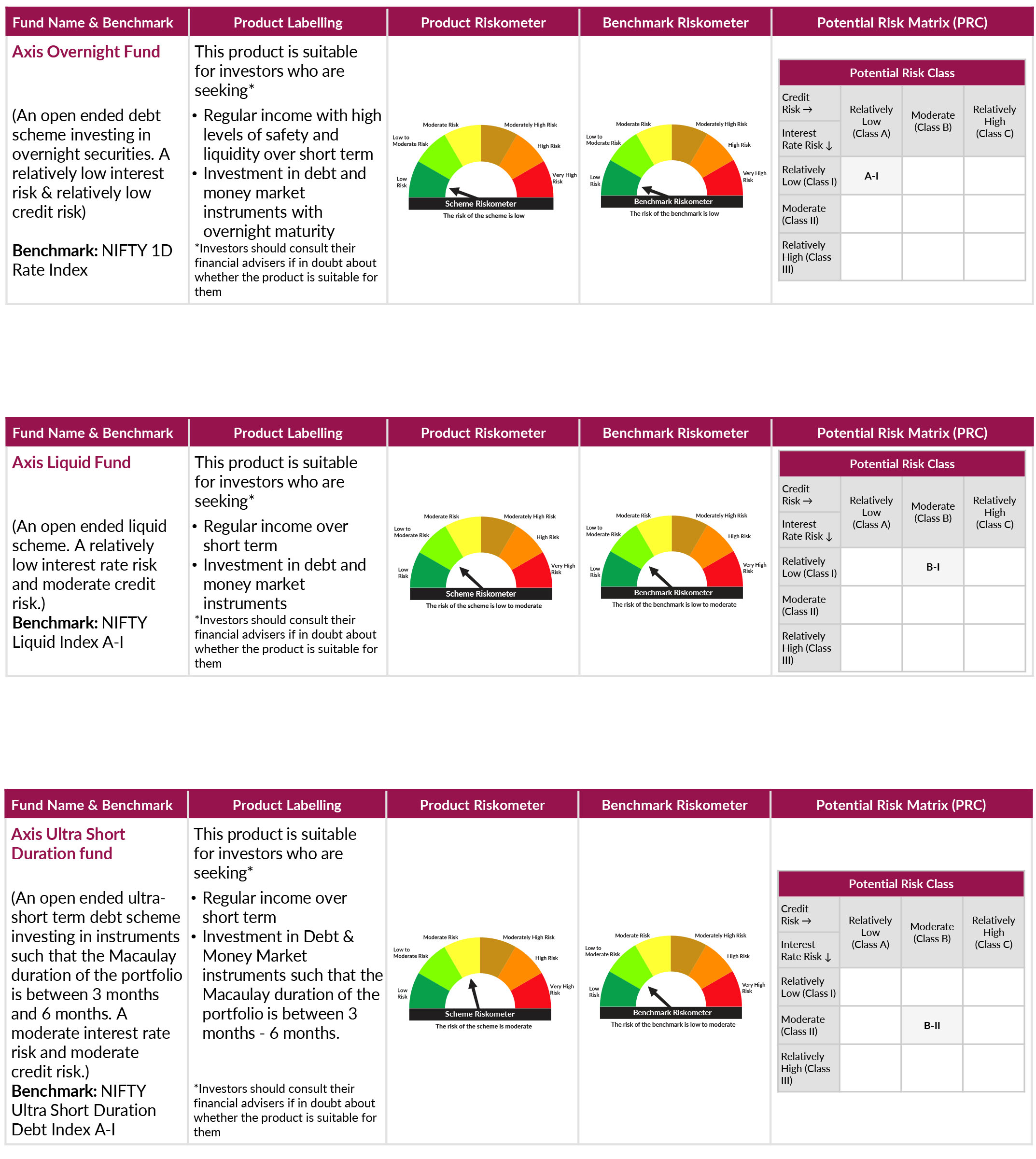 | AXIS OVERNIGHT FUND (An open-ended debt scheme investing in overnight securities) This product is suitable for investors who are seeking* • Regular income with high levels of safety and liquidity over short term. • Investment in debt and money market instruments with overnight maturity |
