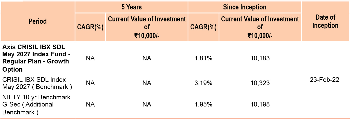 | Axis CRISIL IBX SDL May 2027 Index Fund | 28 Feb 2023 | -0.85% | -- | -- | -- | -1.30% |