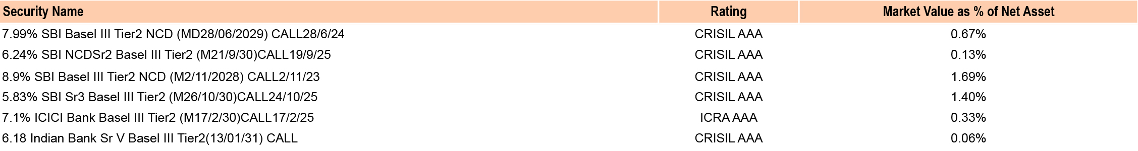 | *As per AMFI Best Practices Guidelines Circular No. 88 / 2020 -21-Additional Disclosures in Monthly Factsheets. For instruments with put/call option, the put/call date has been taken as the maturity date. & The yield to maturity given above is based on the portfolio of funds as on date given above. This should not be taken as an indication of the returns that maybe generated by the fund and the securities bought by the fund may or may not be held till their respective maturities. The calculation is based on the invested corpus of the debt portfolio. | ||