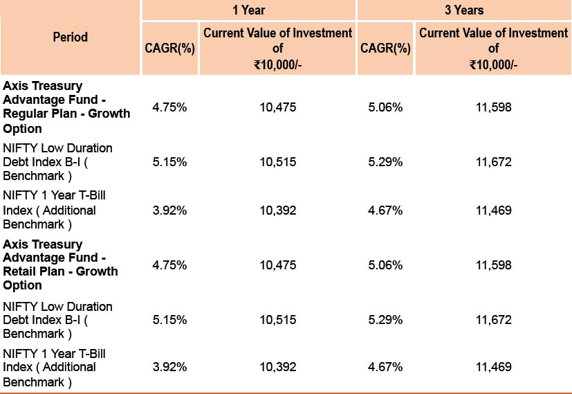 Past performance may or may not be sustained in future. Different plans have different expense structure. Devang Shah is managing the scheme since 7th June 2016 and he manages 14 schemes of Axis Mutual Fund & Aditya Pagaria is managing the scheme since 13th August 2016 and he manages 15 schemes of Axis Mutual Fund . Please refer to annexure for performance of all schemes managed by the fund manager. Returns greater than 1 year period are compounded annualised (CAGR). Face Value per unit : ₹ 1,000.