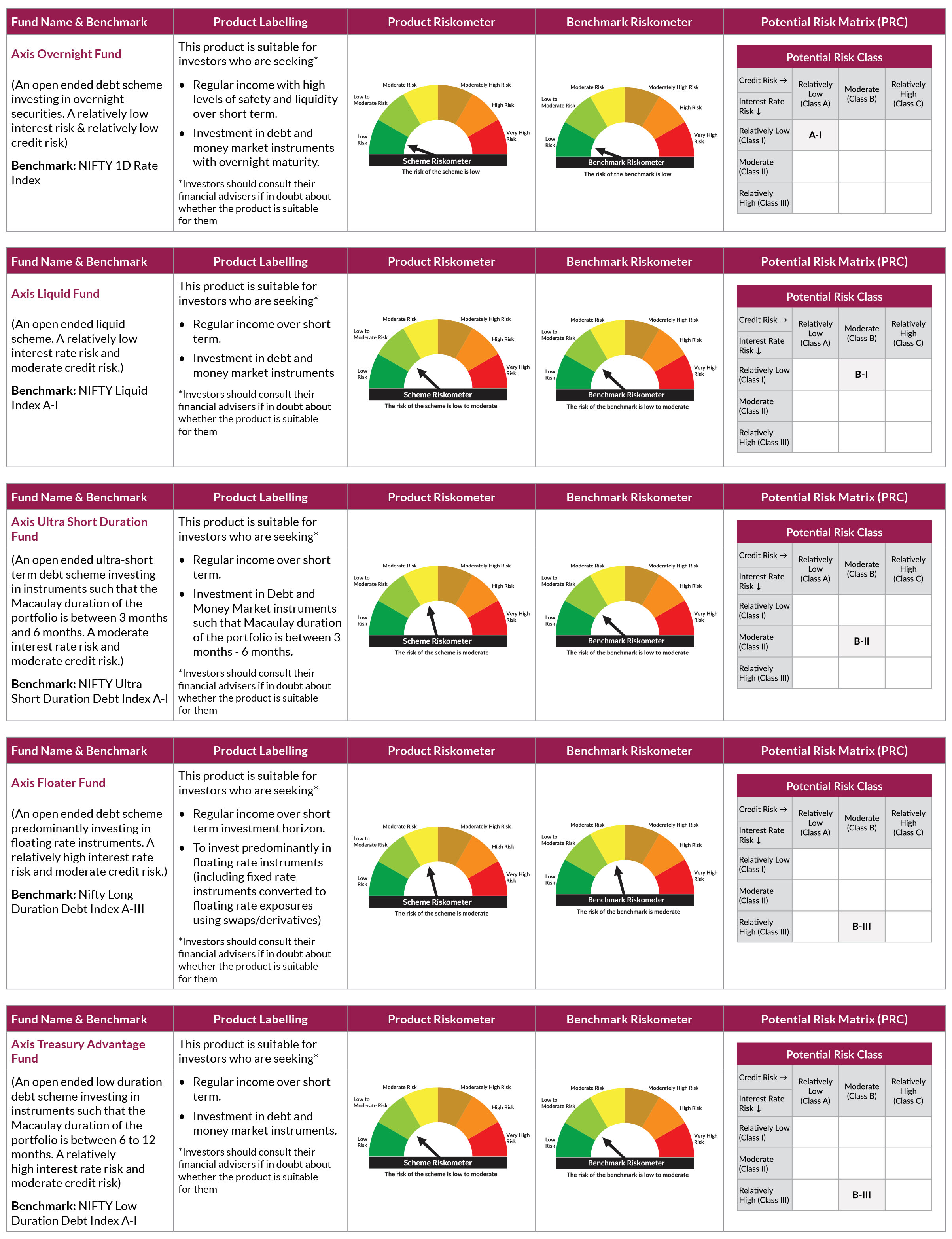 | AXIS OVERNIGHT FUND (An open-ended debt scheme investing in overnight securities) This product is suitable for investors who are seeking* • Regular income with high levels of safety and liquidity over short term. • Investment in debt and money market instruments with overnight maturity |