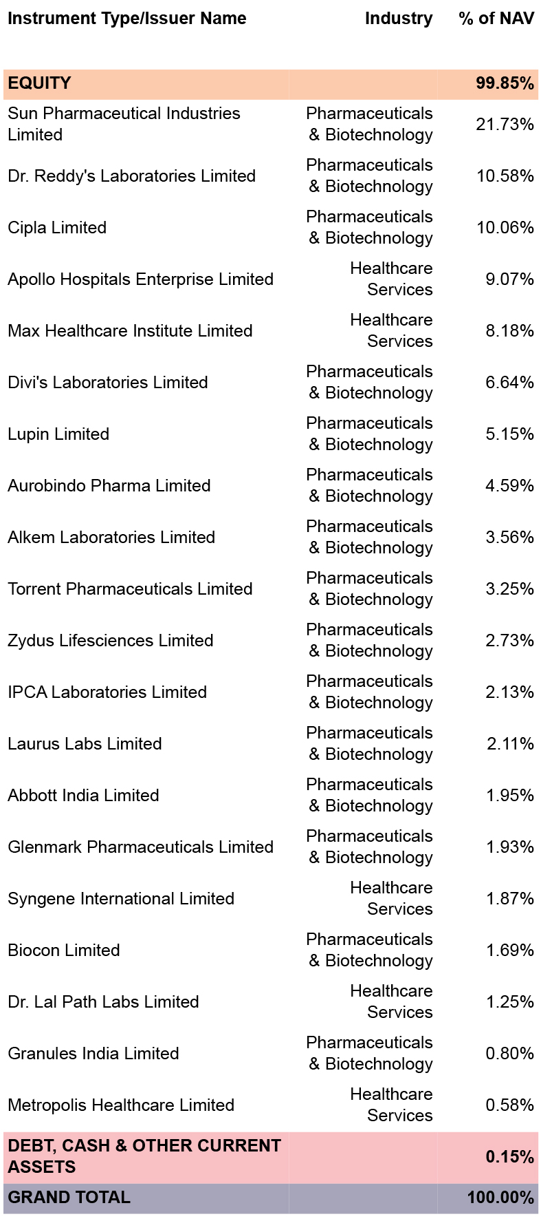 The investment objective of the Scheme is to provide returns before expenses that closely correspond to the total returns of the NIFTY Healthcare Index subject to tracking errors. However, there is no assurance or guarantee that the investment objective of the scheme will be achieved.