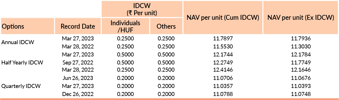 Pursuant to payment of Distribution (of Income & Capital), the NAV of the above stated IDCW options of the scheme/plan would fall to the extent of payout and statutory levy, if any. Past performance may or may not be sustained in future. Face value of units is ₹ 10. IDCW means Income Distribution cum Capital Withdrawal.