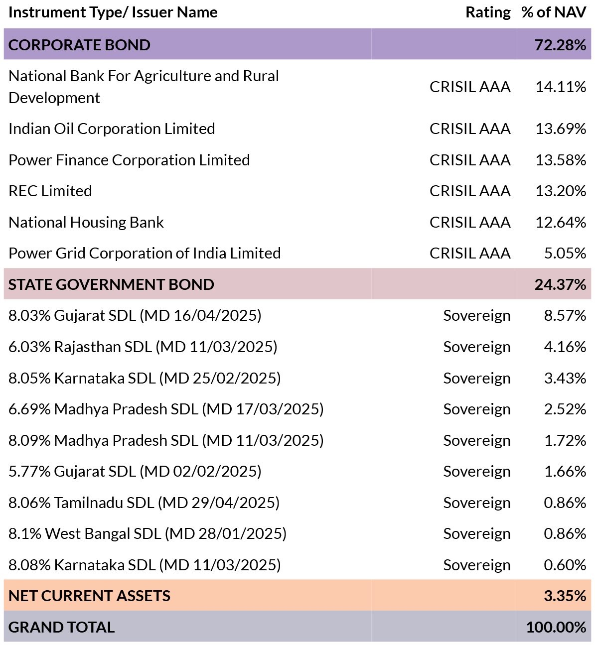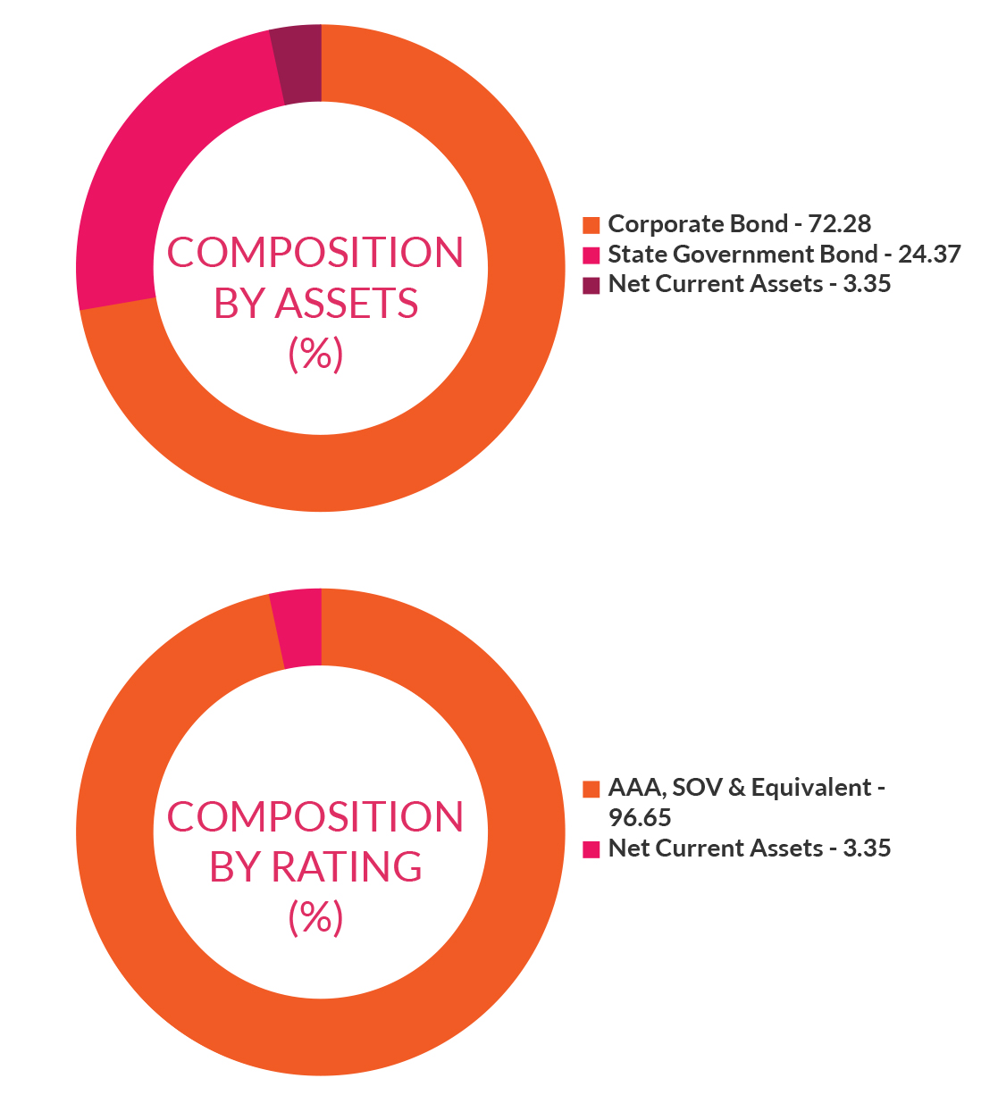 ![]() | RESIDUAL MATURITY | 1.55 years | MODIFIED DURATION* | 1.38 years | MACULARY DURATION* | 1.46 years | Annualised Portfolio YTM * | 7.38% |