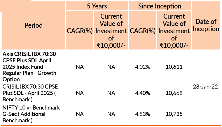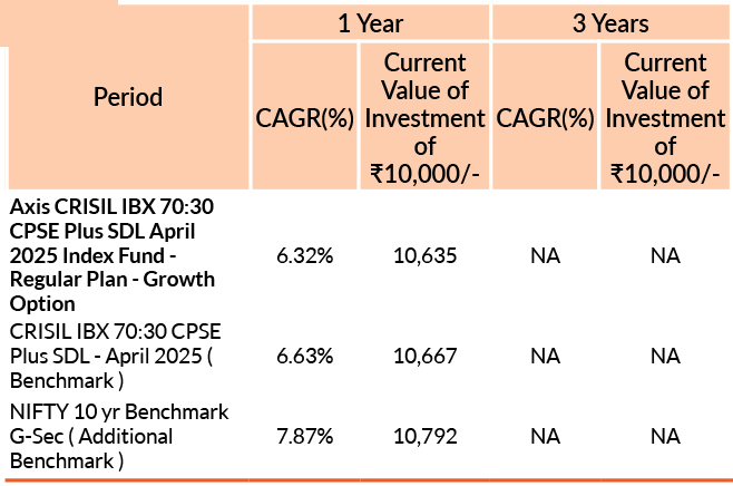Axis CRISIL IBX 70:30 CPSE Plus SDL April 2025 Index Fund | 31-Jul-23 | -0.32% | -- | -- | -- | -0.37% |