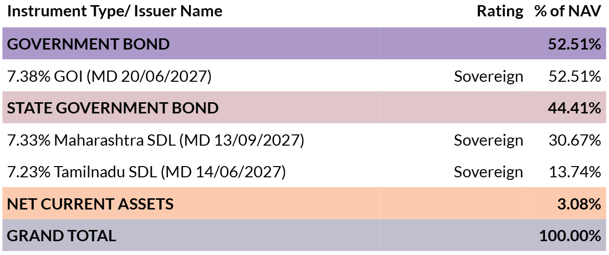 ![]() | RESIDUAL MATURITY | 3.84 years | MODIFIED DURATION* | 3.23 years | MACULARY DURATION* | 3.35 years | Annualised Portfolio YTM * | 7.34% |